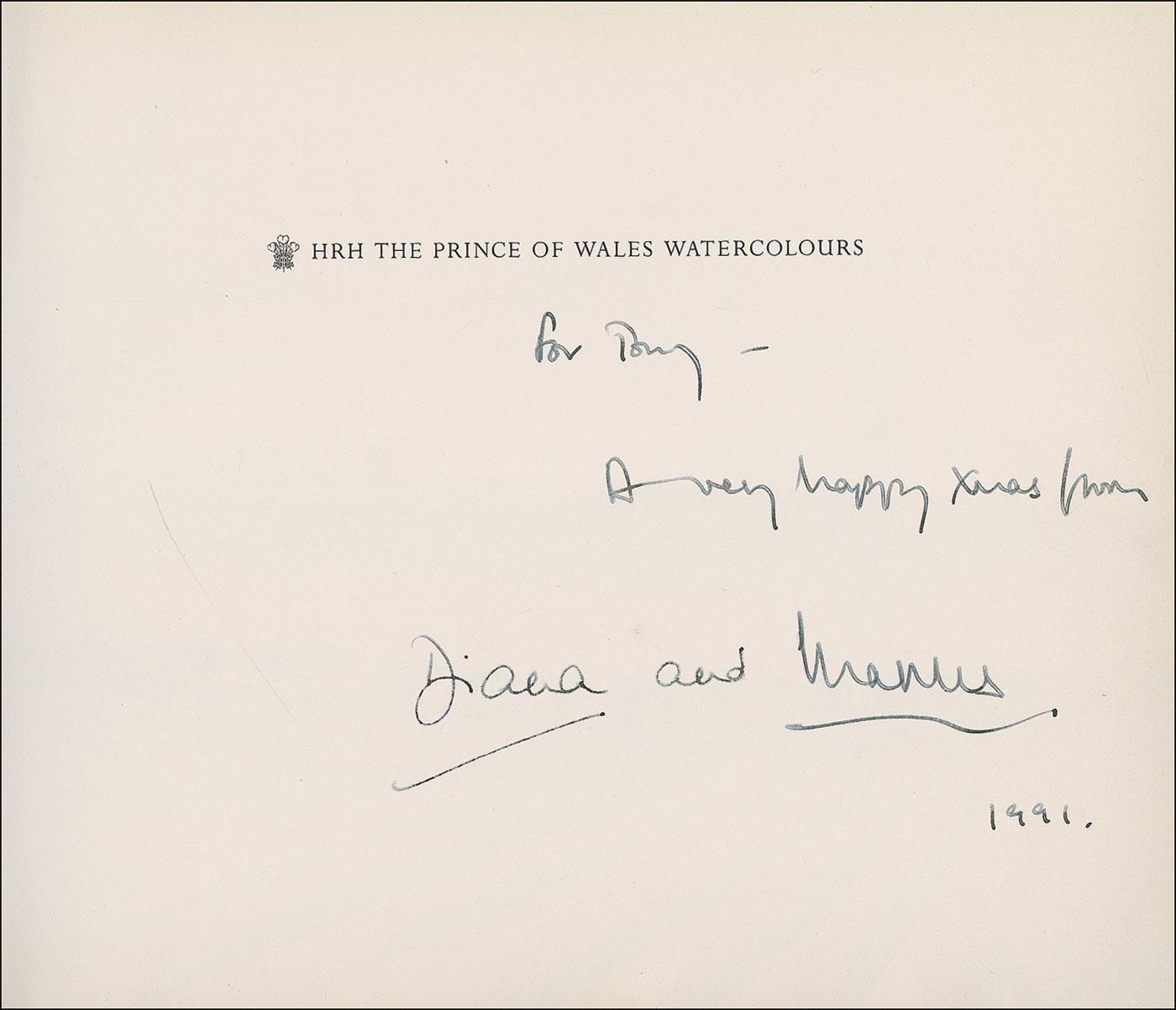 Signed book: HRH The Price of Wales Watercolours. First edition. Boston: Little, Brown and Company, 1991. Hardcover with dustjacket, 11.5 x 9.5, 159 pages. Signed and inscribed on the half-title page, “For Tony—A very happy Xmas from Charles 1991,” with Diana signing in front of her husband, “Diana and.” In fine condition, with light irregular adhesion to Diana’s signature, and some light creasing to top of dustjacket, with surface marks to back of dustjacket. Accompanied by a printed invitation to Mr. And Mrs. Tony Burrows to a luncheon at the Grocer’s Hall in London on December 19, 1985. Mr. Burrows and his wife were clearly close to the Royals—close enough to garner an invitation to a 1985 luncheon and, six years later, to receive “happy Xmas” greetings from Prince Charles and Princess Diana.