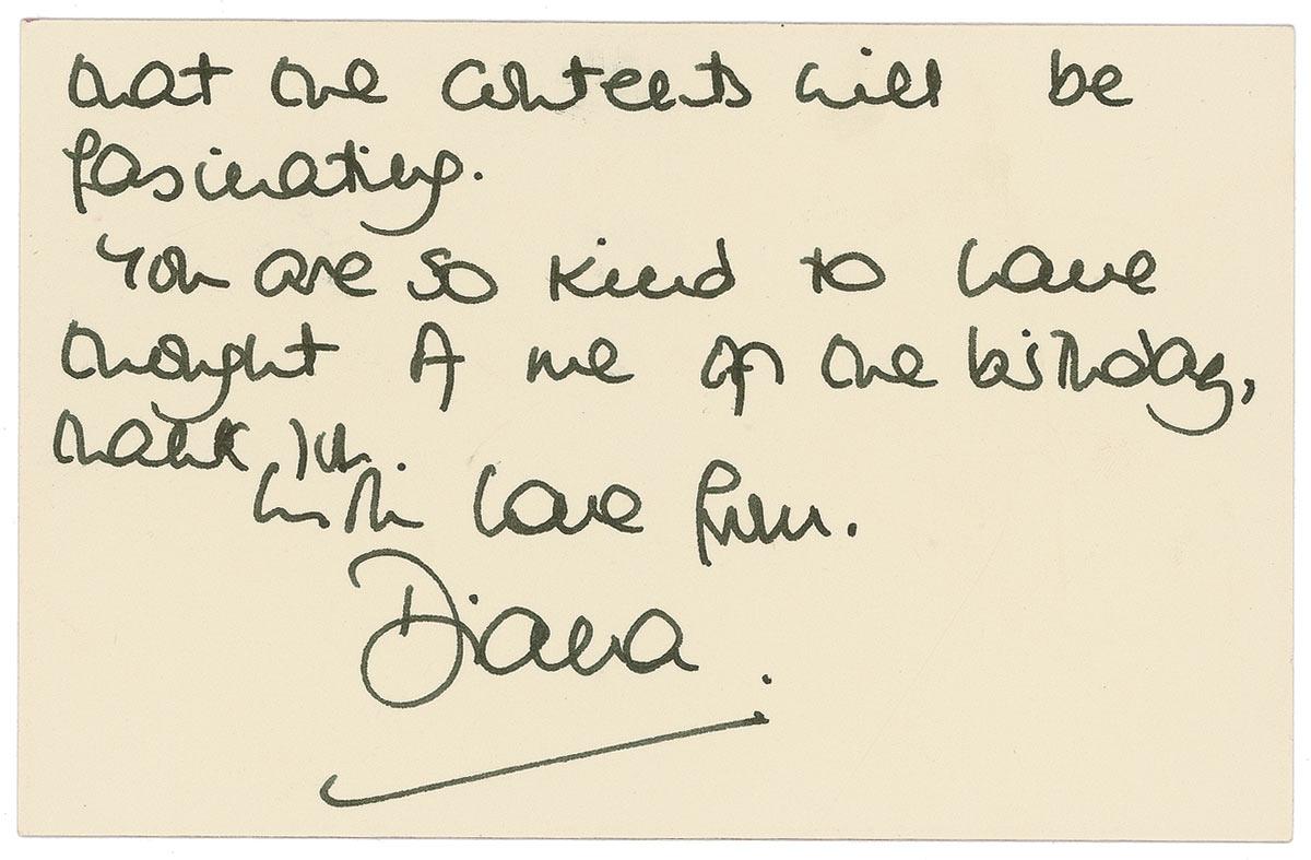 ALS signed “Diana,” both sides of her 6 x 4 red-bordered personal Kensington Palace correspondence card, June 27, 1995. Diana writes to Simon Barnes. In full: “I got a lovely surprise when Jean gave me your present of The Tibetan Book of Living & Dying—a title just up my street & I have no doubt that the contents will be fascinating. You are so kind to have thought of me on the birthday, thank you. With love from, Diana.” Accompanied by the original transmittal envelope bearing Barnes’s name in Diana’s hand and initialed by her at lower left, “D.” In very fine condition.