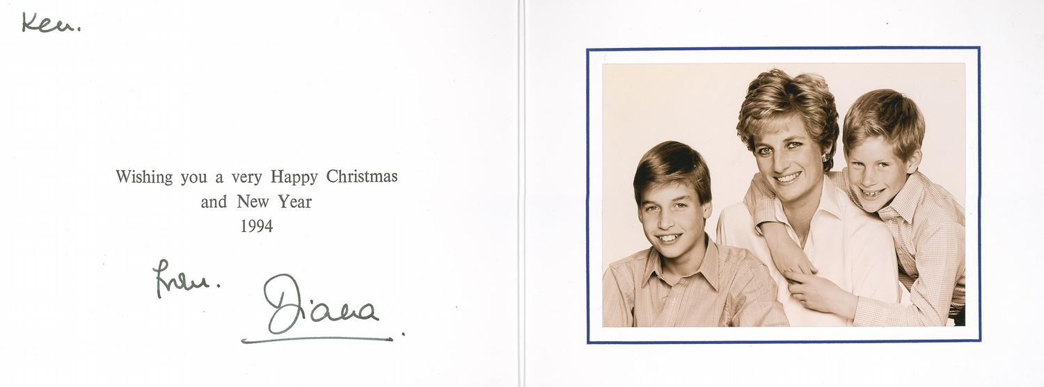 Christmas card from 1994, 8 x 6 closed, embossed in gold on the outside with the royal coat of arms. Inside, the card bears a charming and informal family satin-finish photograph of Diana with William and Harry. Printed opposite the photograph is the sentiment “Wishing you a very Happy Christmas and New Year 1994.” Signed in black ink, “From, Diana,” adding an inscription to the top, “Ken.” In very fine condition. Touching remembrance of Diana after her highly-publicized separation from Prince Charles.