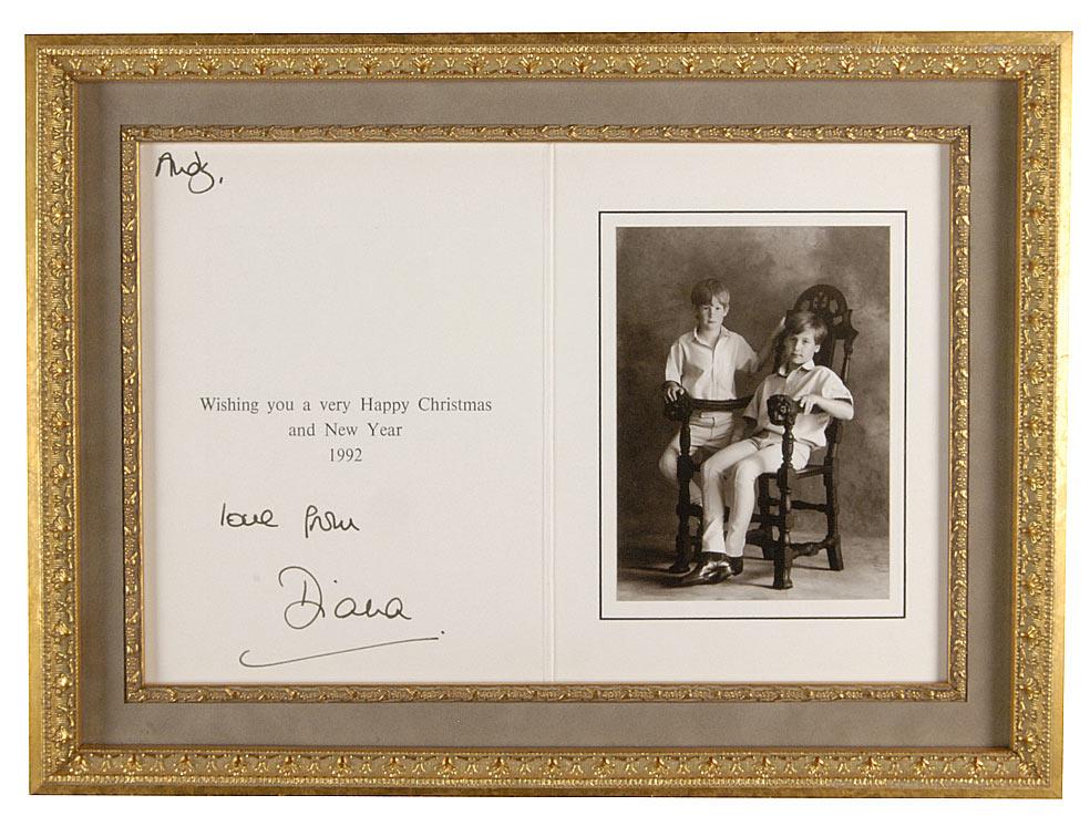 Rare ‘divorce card’ sent by the newly separated Princess of Wales at Christmas 1992, 6 x 8, closed, emblazoned with the Prince of Wales’ feathers and the Garter motto on the cover, featuring inside a solemn 4 x 5.5 satin finish photo of the little princes alone. Printed opposite the photo is the sentiment, “Wishing you a very Happy Christmas and New Year 1992,” and signed at the bottom in black ink, “Love from Diana,” and also inscribed at the top by Diana to “Andy.” Beautifully suede matted and framed to an overall size of 14.75 x 11. In fine condition. For the first time since their wedding, neither Prince Charles nor Princess Diana were pictured on the 1992 Christmas card. Some were signed by both the Prince and Princess and some were sent separately. A beautifully signed example of the not-so-subtle message of the end of Diana’s marriage.