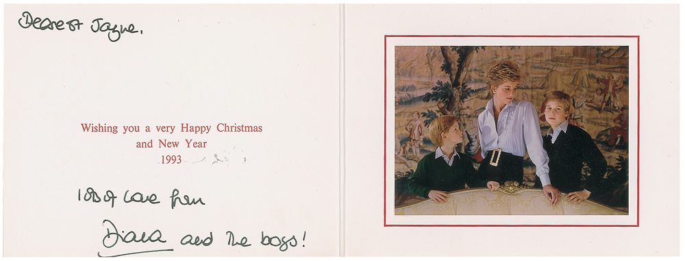 Christmas card from 1993, 8 x 6 folded, opens to 16 x 6, embossed in gold on the outside with the family arms. Inside, the card bears a charming color satin-finish 5.5 x 4 color family photograph of Diana, William, and Harry posing in front of a tapestry. Printed opposite the photograph is the sentiment “Wishing you a very Happy Christmas and New Year 1993.” Diana has inscribed the card, ”Dearest Jayne,” and signed at the bottom, “lots of love from Diana and the boys!” In fine condition, with some stray ink marks next to printed sentiment. Accompanied by the original transmittal envelope, addressed by Diana, “Jayne,” and signed in the lower left corner, “D.” Also accompanied by the original mailing envelope, addressed to Jayne Kear at Walt Disney World Corporation. Despite the absence of Prince Charles in the photograph or in the card, the couple was still married. It was not until 1996 that the divorce was finalized.