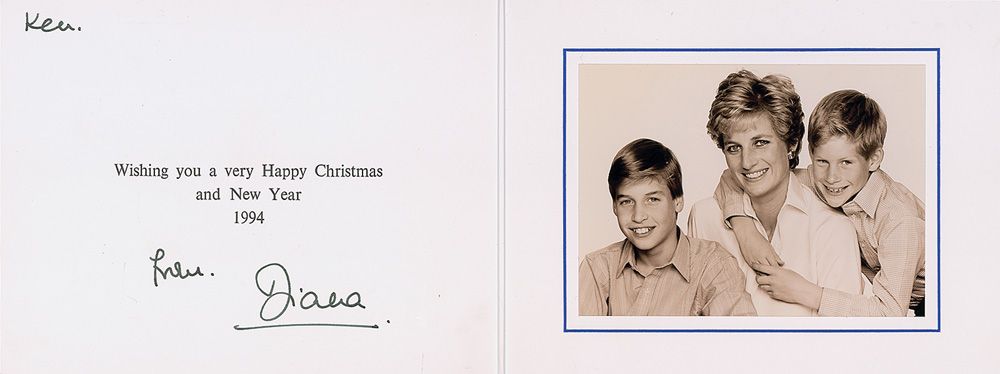 Christmas card from 1994, 8 x 6 closed, embossed in gold on the outside with the royal coat of arms. Inside, the card bears a charming and informal family satin-finish photograph of Diana with William and Harry. Printed opposite the photograph is the sentiment “Wishing you a very Happy Christmas and New Year 1994.” Signed in black ink, “From, Diana,” adding an inscription to the top, “Ken.” In fine condition.