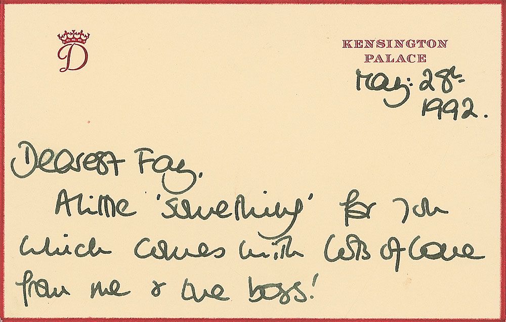 ALS, one page both sides, 6.25 x 4, Kensington Palace letterhead, May 28, 1992. Short letter to Fay Appleby. In full: “A little ‘something’ for you which comes with lots of love from me & the boys! We miss you a great deal & think about you a lot.” In very fine condition. Accompanied by the original transmittal envelope, addressed by Diana, “Fay.” Fay Appleby traveled the world with Diana for six years, and later was secretly supported by Diana during a lengthy battle with cancer, which would ultimately take her life in 2002.