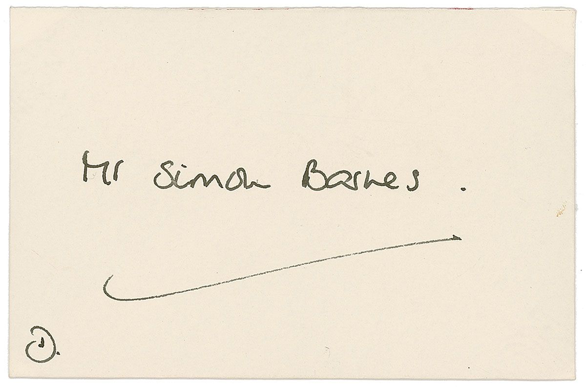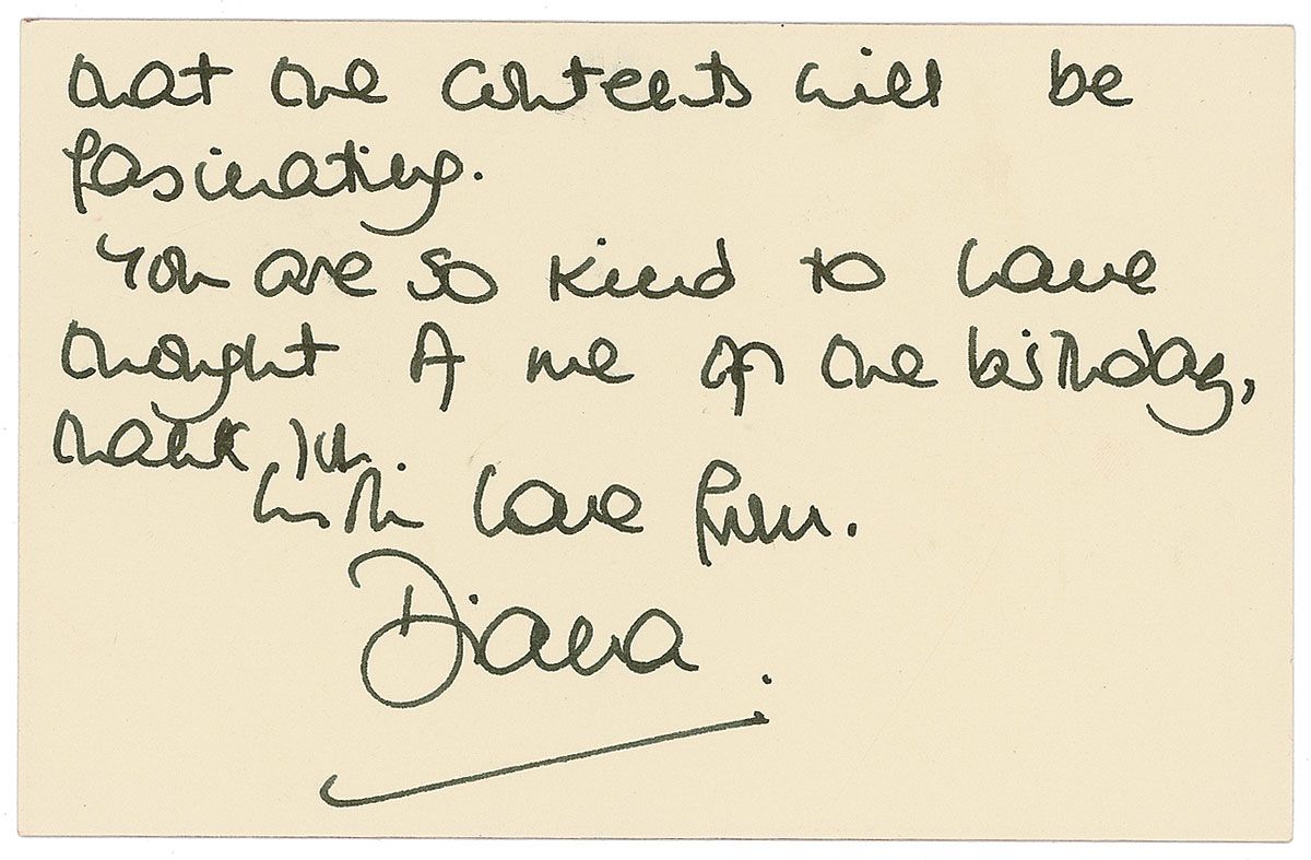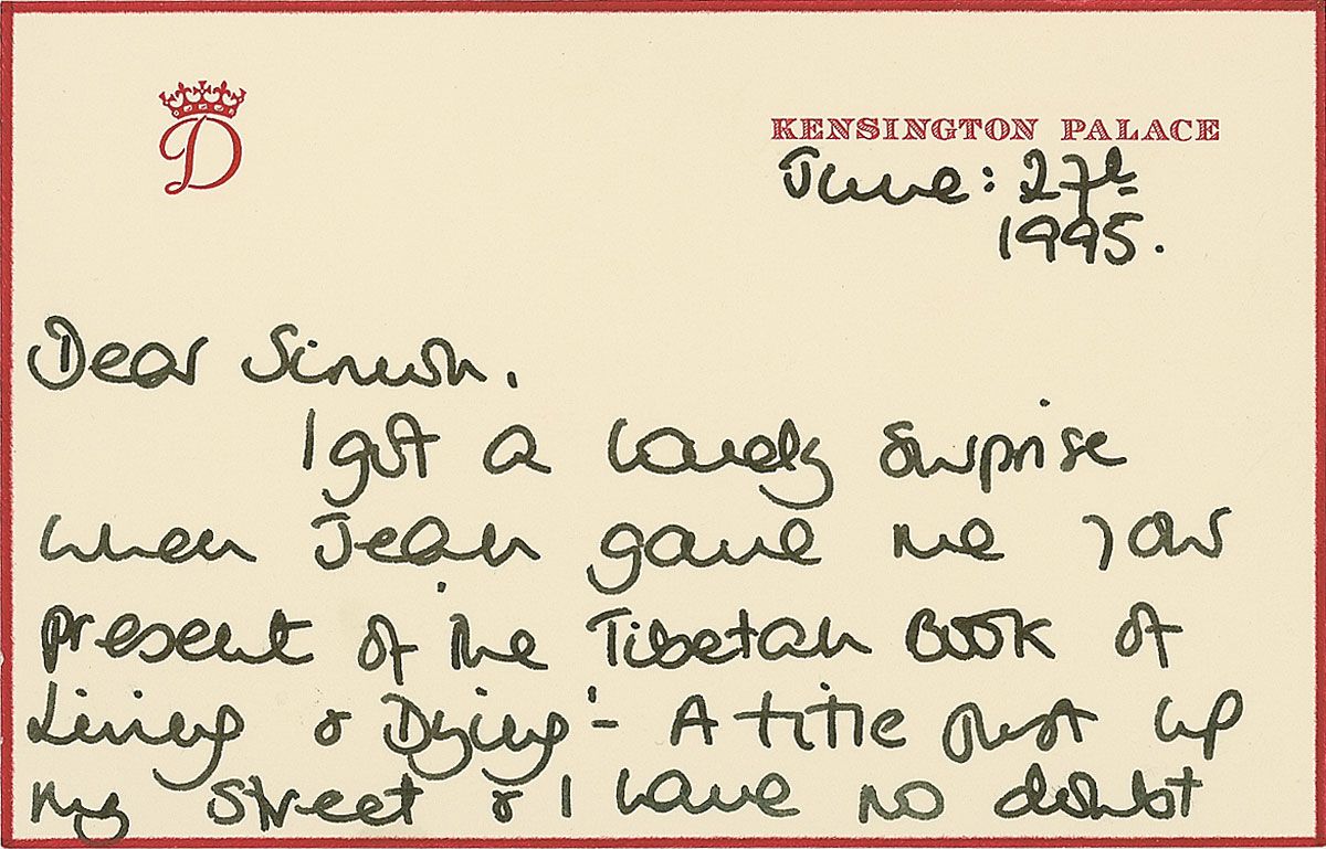 ALS signed “Diana,” both sides of her 6 x 4 red-bordered personal Kensington Palace correspondence card, June 27, 1995. Diana writes to Simon Barnes. In full: “I got a lovely surprise when Jean gave me your present of The Tibetan Book of Living & Dying—a title just up my street & I have no doubt that the contents will be fascinating. You are so kind to have thought of me on the birthday, thank you. With love from, Diana.” Accompanied by the original transmittal envelope bearing Barnes’s name in Diana’s hand and initialed by her at lower left, “D.” In very fine condition.