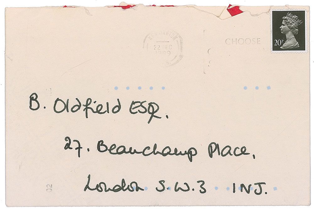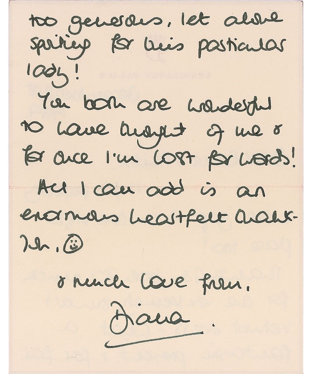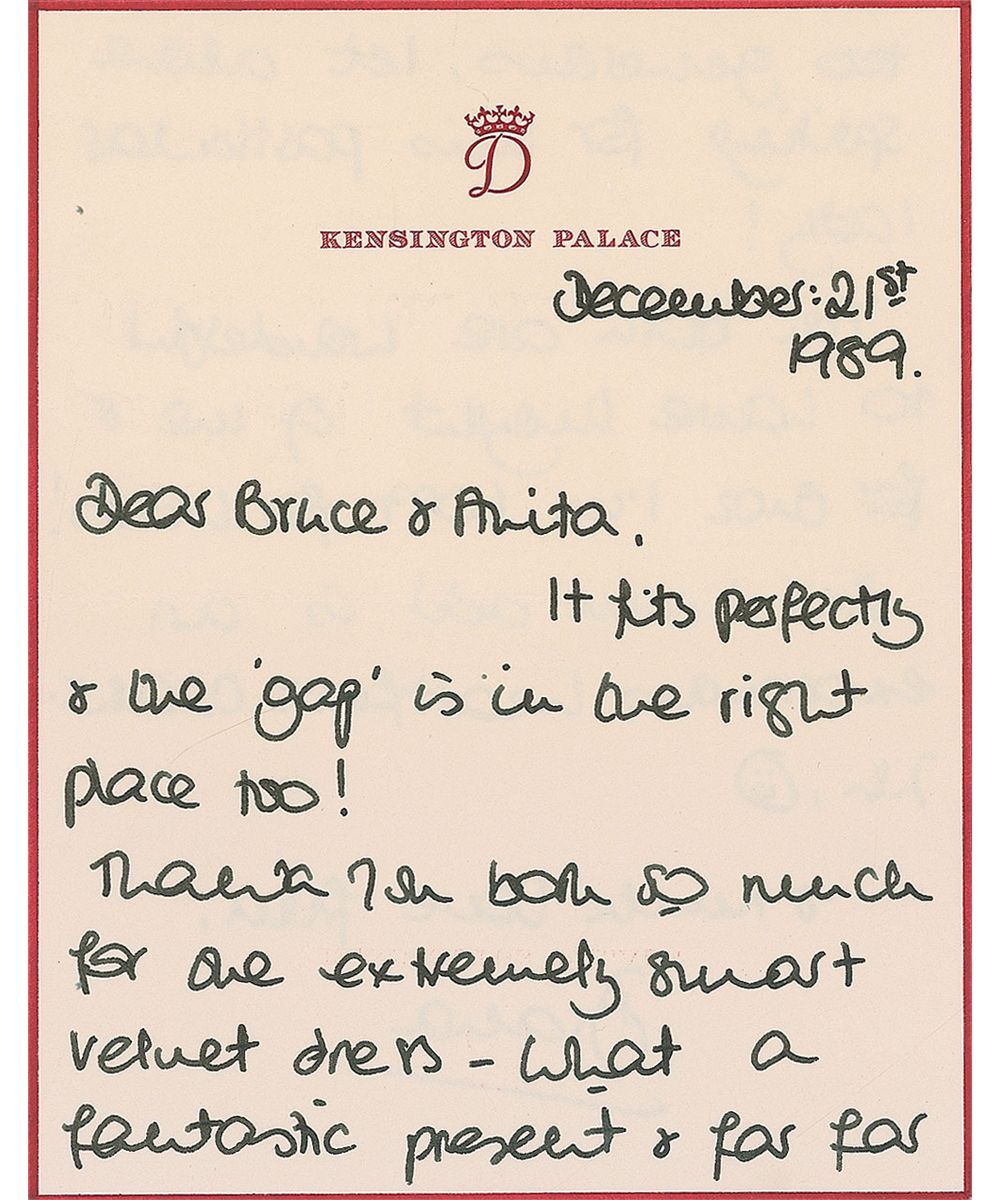 ALS, one page both sides, 5.25 x 7, Kensington Palace letterhead, December 21, 1989. Letter to fashion designer Bruce Oldfield. In full: “It fits perfectly & the ‘gap’ is in the right place too! Thank you both so much for one extremely smart velvet dress—What a fantastic present & far far too generous, let alone sporting for this particular lady! You both are wonderful to have thought of me & for once I’m lost for words! All I can add is an enormous heartfelt thank-you,” with Diana adding a happy face at the end of the sentence. In fine condition. Accompanied by the original mailing envelope addressed in Diana’s hand. Oldfield had been designing clothes for Diana since 1981 and helped transform her into the world’s biggest style icon.
