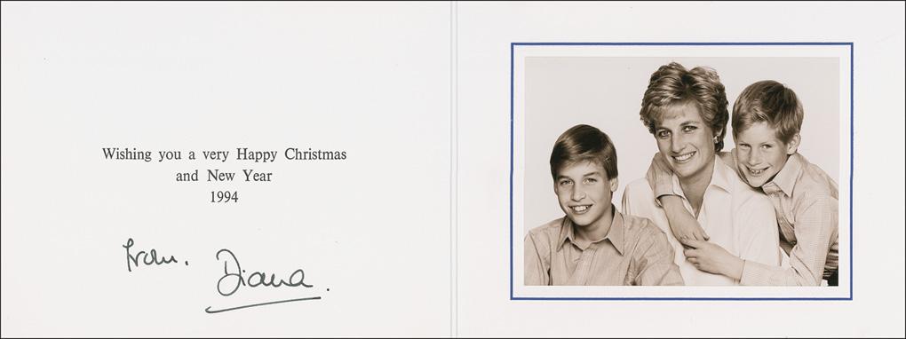 Christmas card from 1994, 8 x 6 closed, embossed in gold on the outside with the royal coat of arms. Inside, the card bears a charming and informal family satin-finish photograph of Diana with William and Harry. Printed opposite the photograph is the sentiment “Wishing you a very Happy Christmas and New Year 1994.” Signed at the bottom in black ink, “From, Diana.” Accompanied by the original mailing envelope, addressed to Warrant Officer William Woodcock. In very fine condition. A touching remembrance of Diana after her separation from Prince Charles.