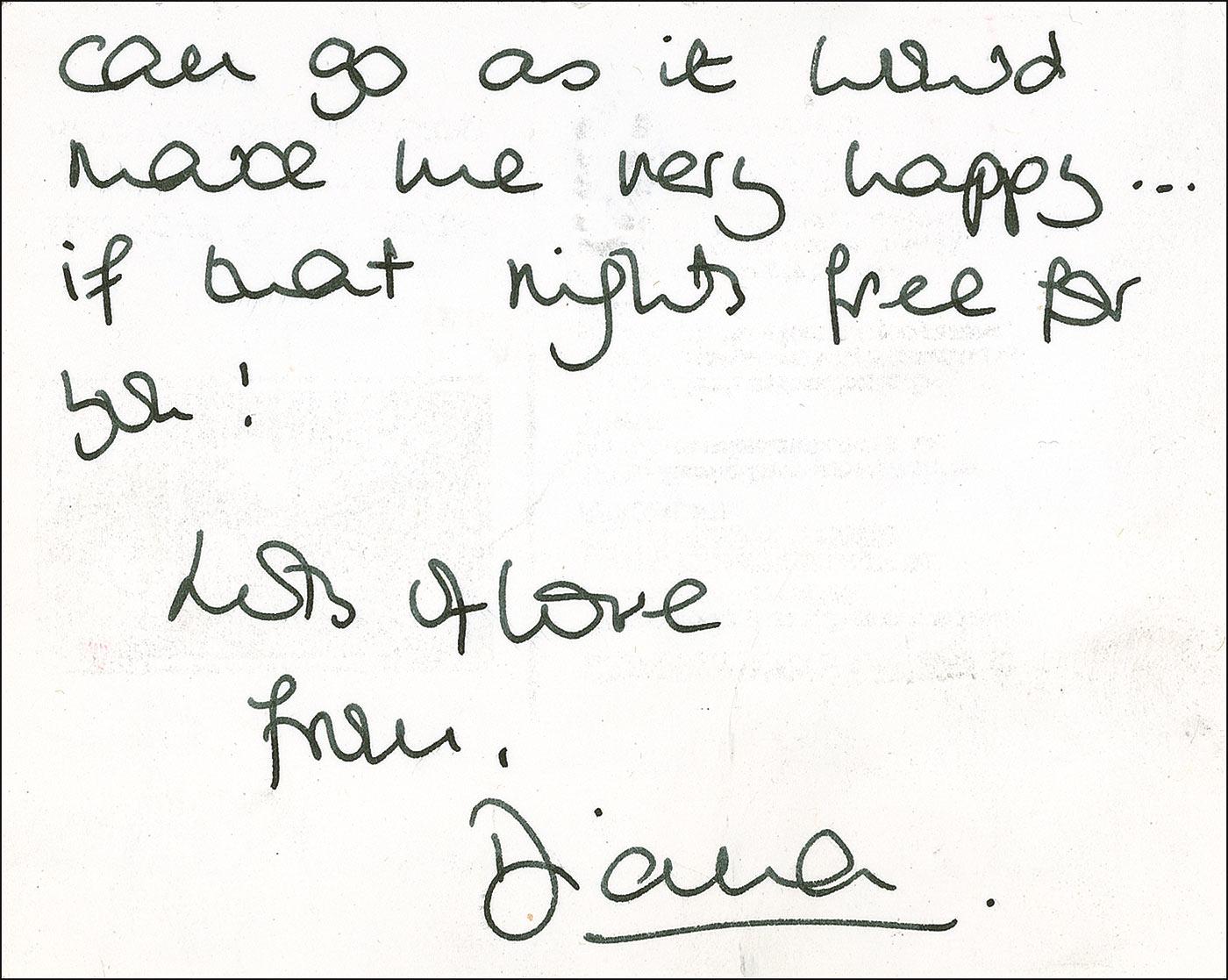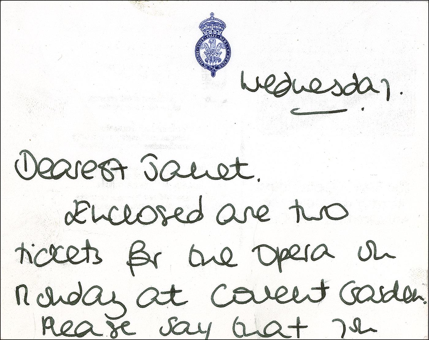 ALS, one page both sides, 4.75 x 4, family coat of arms letterhead, no date, but presumably October of 1988. Letter to her friend Janet forwarding two opera tickets. In full: “Enclosed are two tickets for the opera on Monday at Covent Garden. Please say that you can go as it would make me very happy…if that night’s free for you!” A few light creases, and a bit of light soiling and ink transfer from printing on tickets, otherwise fine condition. Accompanied by the two tickets to Falstaff at the Royal Opera House mentioned in the letter, as well as a ticket for the 1988 Woman of the Year Luncheon held on October 24, 1988. Pre-certified John Reznikoff/PSA/DNA and RRAuction COA.