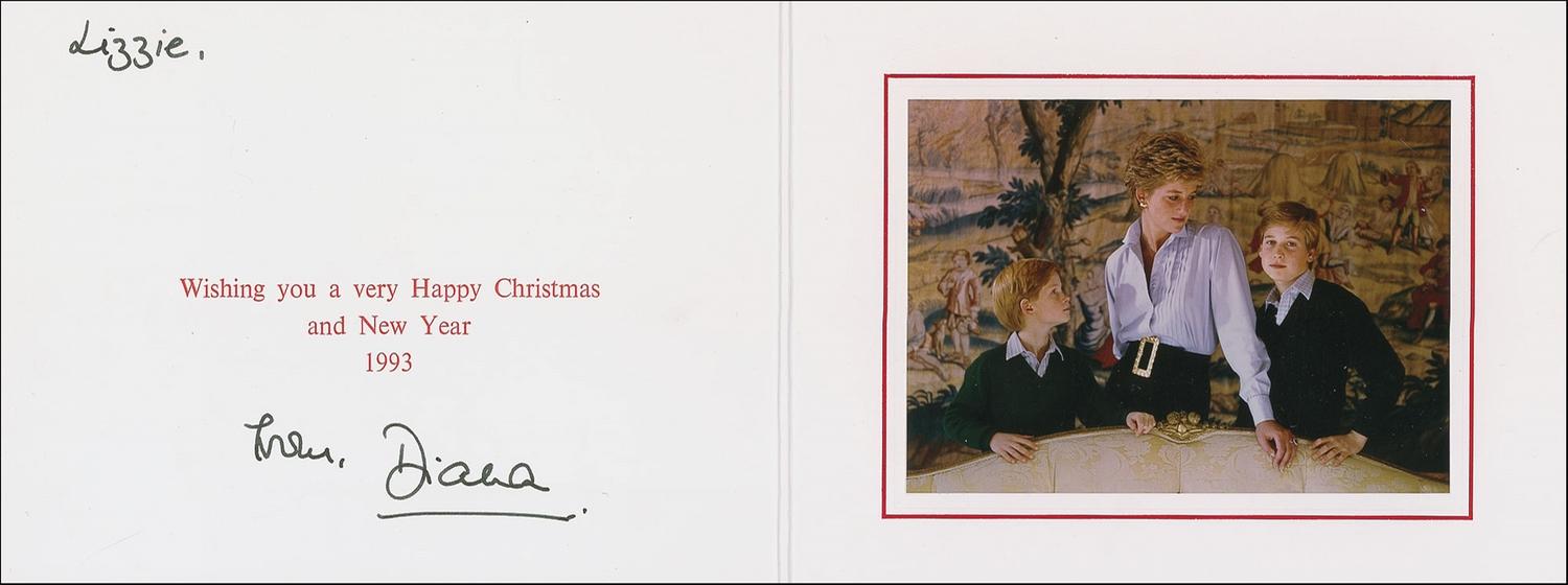 Christmas card from 1993, 8 x 6 folded, opens to 16 x 6, embossed in gold on the outside with the royal coat of arms. Inside, the card bears a charming satin-finish 5.5 x 4 color casual family photograph of Diana and her children, William and Harry. Printed opposite the photograph is the sentiment “Wishing you a very Happy Christmas and New Year 1993,” inscribed at the top “Lizzie” and signed at the bottom in black felt tip, “Love, Diana.” In very fine condition. Accompanied by the original transmittal envelope to Miss Elizabeth Norris, who worked for Charles and Diana at St. James Palace. Touching remembrance of Diana with the photo embodying the love shared between her and her sons. Accompanied by a letter of provenance from Elizabeth Norris and her husband Colin Burgess.