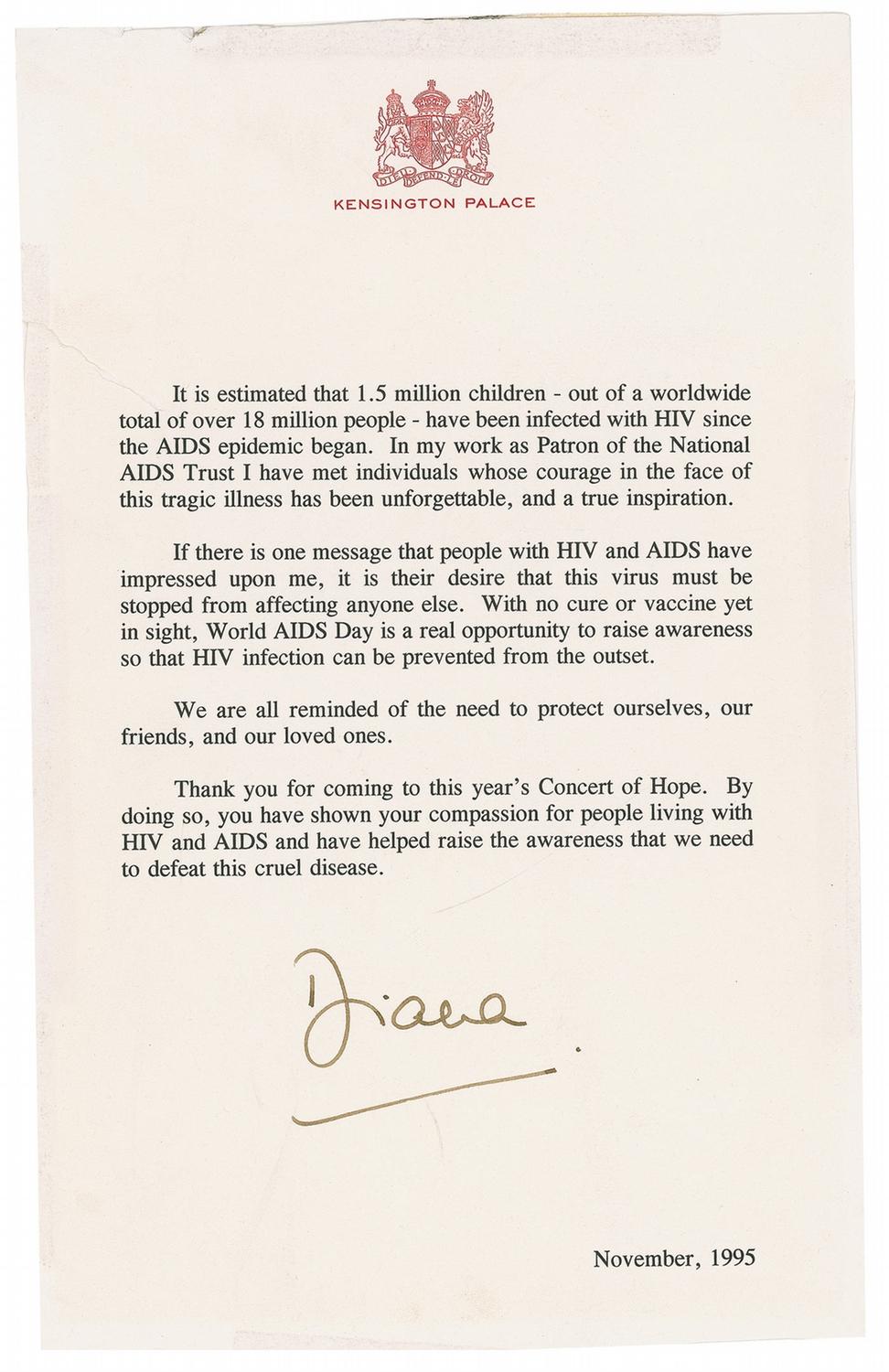 TLS, one page, 8 x 12.75, Kensington Palace letterhead, November 1995, signed in brown fountain pen at the conclusion, “Diana.” Printed ‘thank you’ message—the original document from which subsequent ‘form letters’ were created—to attendees of a fundraiser. In full: “It is estimated that 1.5 million children—out of a worldwide total of over 18 million people—have been infected with HIV since the AIDS epidemic began. In my work as Patron of the National AIDS Trust I have met individuals whose courage in the face of this tragic illness has been unforgettable, and a true inspiration. If there is one message that people with HIV and AIDS have impressed upon me, it is their desire that this virus must be stopped from affecting anyone else. With no cure or vaccine yet in sight, World AIDS Day is a real opportunity to raise awareness so that HIV infection can be prevented from the outset. We are all reminded of the need to protect ourselves, our friends, and our loved ones. Thank you for coming to this year’s Concert of Hope. By doing so, you have shown your compassion for people living with HIV and AIDS and have helped raise the awareness that we need to defeat this cruel disease.” In very good condition, with scattered light creasing, two tears at the left and right side (left tear impinges on the text), trimmed edges, show-through from masking tape on the reverse, and a faint block of uniform overall toning. Most of the flaws can be matted out if so desired to create an attractive display. Accompanied by an unsigned photo of Diana and singer George Michael at a World AIDS Day Concert at Wembley Arena. Diana arranged the Concert of Hope in Cardiff in June 1995 to raise money for Ty Hafan, a hospice that opened in July 1995. Her work with and dedication to victims of AIDS was symbolic of her rebellious streak, as the high-profile Princess of Wales used her celebrity to humanize those afflicted—especially children—and helped change people’s opinions and attitudes to the disease. Many observers praised her for assisting the National AIDS Trust, a charity not in keeping with the protocol and tradition of the Royal family. A truly one-of-a-kind item from an equally unique person.