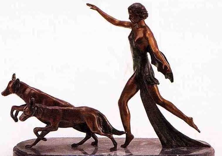 "Diane And The Wolves" Bronze Sculpture - After Chiparus - Museum Brown Finish - Mounted On A Fine Italian Marble Base - Beautifully Detailed - Signed - Mint Condition - 13"H X 17"W - Lost Wax Cast Bronze
