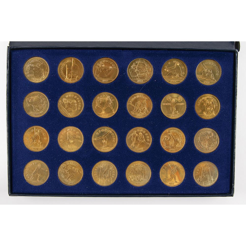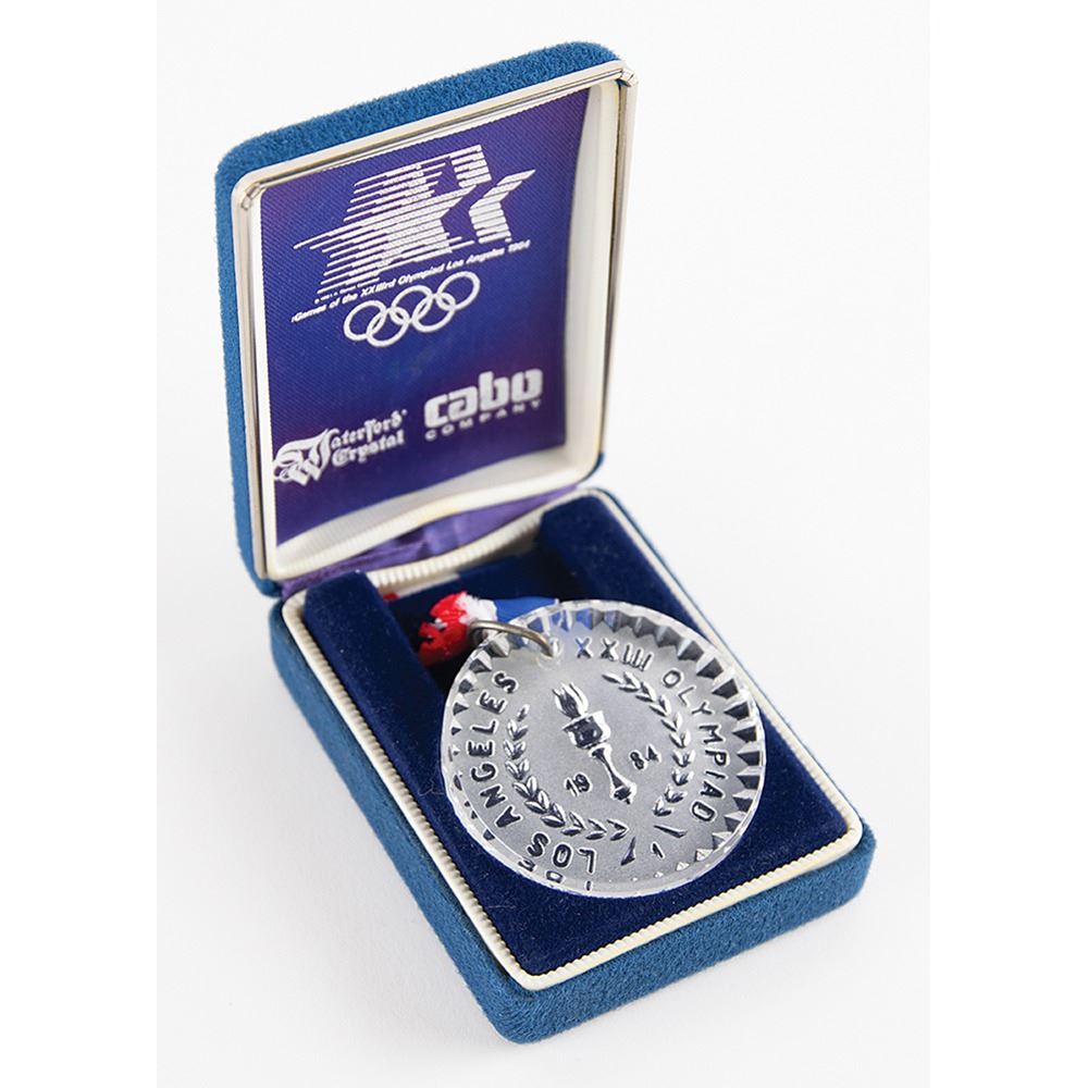 Ephemera and commemorative souvenirs from the Los Angeles 1984 Summer Olympics—an official Rapid Transit District (RTD) commemorative set of 24 bronze-tone transit fare tokens designed and crafted to illustrate the 23 sports represented at the XXIII Olympiad, with the 24th representing the spirit of the games held in LA (housed in their original presentation case); a commemorative engraved glass pendant, 2Ë in diameter, honoring the 1984 LA Games, made by Waterford Crystal and the Cabo Company, with patriotic ribbon and original presentation case; a softcover booklet entitled Cardinal & Gold: USC Olympians, 1904-1984, published by the University of Southern California; and a complete issue of the Olympic Record: The Official Daily Start Lists & Results, of the 1984 LA Olympics, for Day 9, August 6, 1984. In overall fine condition, with wear and a fold to program, and wear to the transit token case cover and its accompanying slipcase.