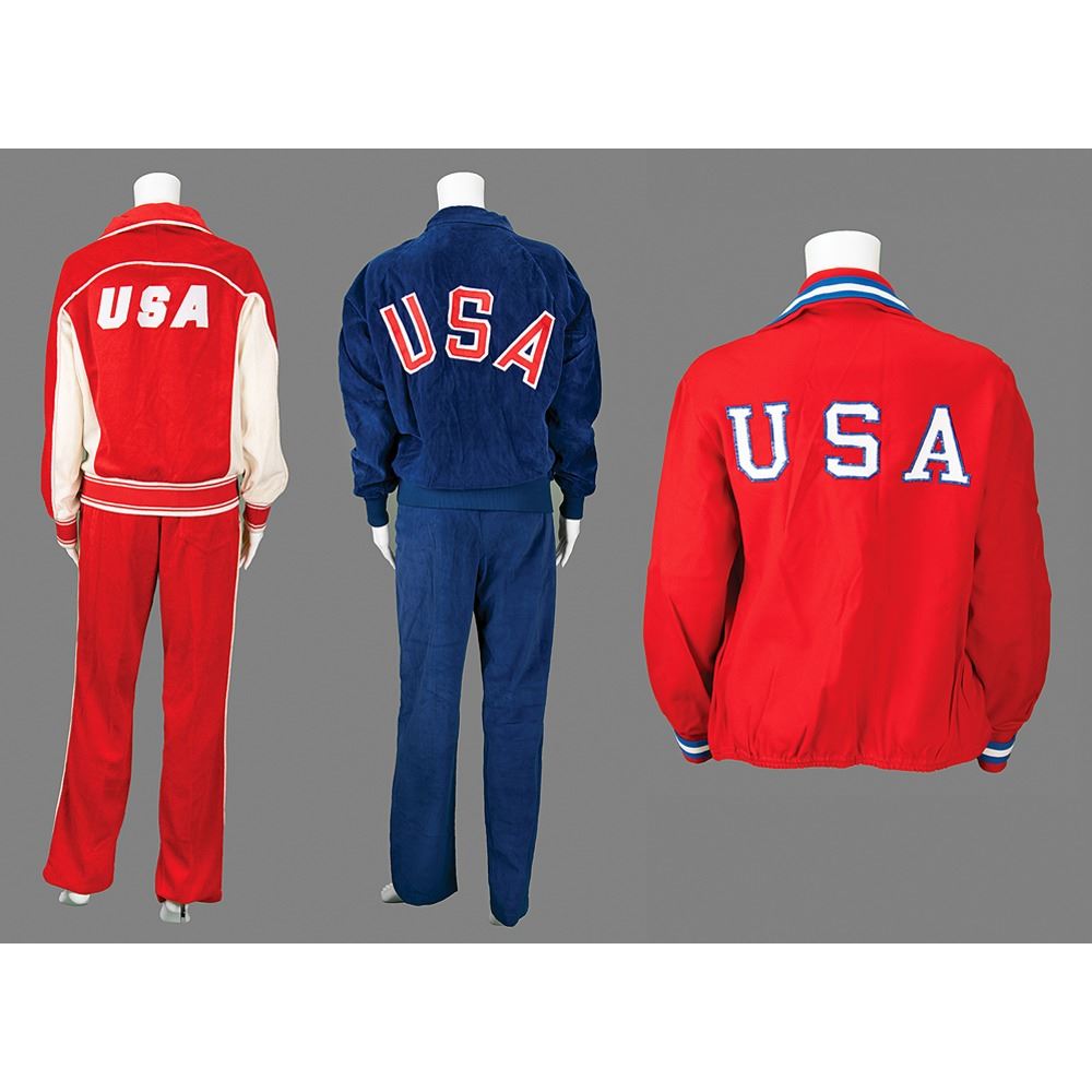 Team USA warm-up uniforms belonging to Diane Moyer, a goalkeeper for the American women’s field hockey team that won a bronze medal at the Los Angeles 1984 Summer Olympics. Includes two plush (acrylic and polyester) jacket and pants ensembles, and a zippered nylon jacket. The solid blue plush ensemble is made by Nike, size medium, with the back of the jacket featuring large embroidered letters: “USA.†The red plush outfit is made by Levi’s, small (pants) and large (jacket), which bears a “National Sports Festival†patch to the left chest, and the back emblazoned: “USA.†The nylon zippered jacket, size large, bears an embroidered United States Field Hockey Association emblem to the left chest, and the back bears large “USA†lettering. In overall fine condition.