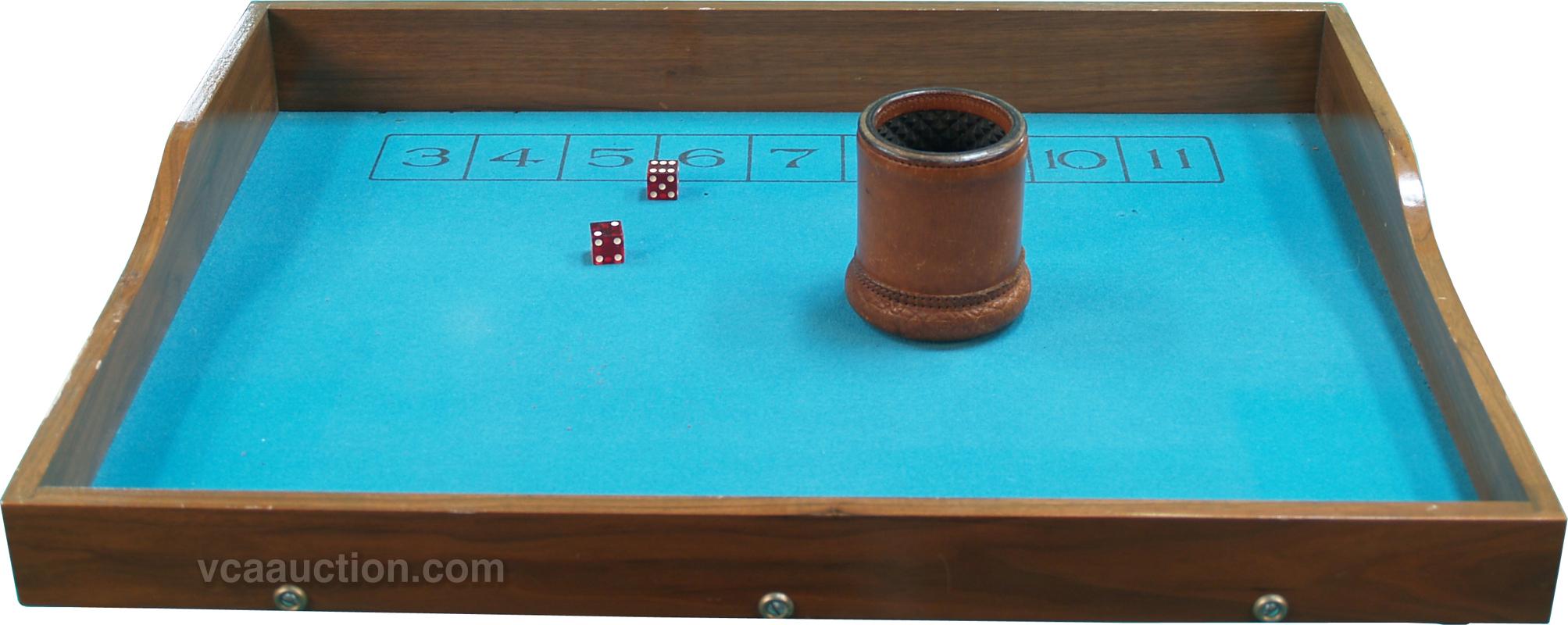 Dice Mat - Layout shows the numbers 3 - 11 and was probably used to play Bing, Beat My Shake, or similar dice games. Wood and felt in excellent condition, billiard ball puck, dice cup and dice included. Measures 24" x 18", c1940s.