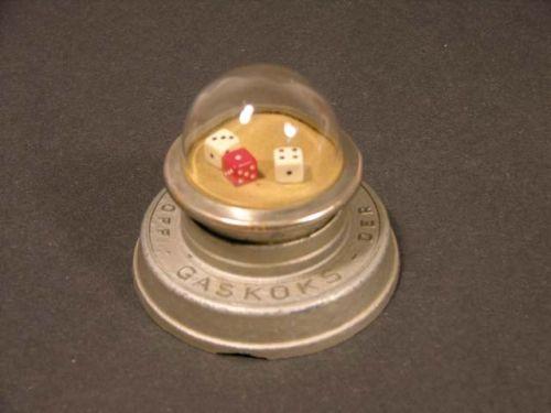 Dice under glass pushtop - German writing on base, ca. 1910. 3 1/4" x 2 3/4". Works.