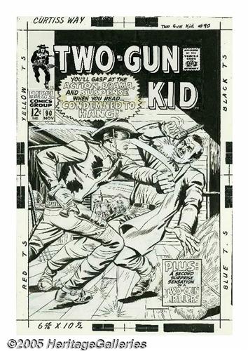 <B>Dick Ayers - Two-Gun Kid #90 Cover Original Art (Marvel,1967).</B></I> This hard-hitting cover demonstrates the folly of taking on the Two Gun Kid <I>man a mano</B></I>. Silver Age Marvel covers always pack a whallop thanks to their large size. The image area of this superb slug-fest measures 13.5" x 20". The cover retains its original type stats, and aside from touches of white-out used for art corrections, the art is in Very Good condition.