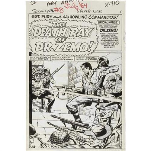 <B>Dick Ayers and George Roussos (as George Bell) - Sgt. Fury #8, Splash Page 1 Original Art (Marvel, 1964).</B></I> Sgt. Fury and the Howlers face the menace of "The Death Ray of Dr. Zemo" in this mighty Marvel milestone from issue #8. This page has an image area of 12.5" x 18.5" and aside from extensive white-out used to eliminate unnecessary background details, this art is in Very Good condition.<BR><BR><b>Shipping:</b> Flat Material, Large (<a target="_blank" href="http://www.heritageauctions.com/common/shipping.php">view shipping information</a>)