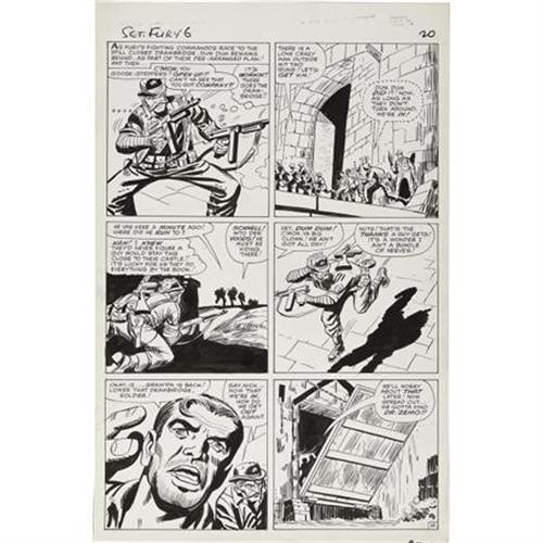 <B>Dick Ayers and George Roussos (as George Bell) - Sgt. Fury #8, page 16 Original Art (Marvel, 1964).</B></I> Dum Dum Dugan doubles-up on his machine gun work in this quick-firing page from "The Death Ray of Dr. Zemo." Nick Fury gets some "face time" in panel five. This page has an image area of 12.5" x 18.5" and the art is in Excellent condition.<BR><BR><b>Shipping:</b> Flat Material, Large (<a target="_blank" href="http://www.heritageauctions.com/common/shipping.php">view shipping information</a>)