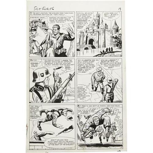 <B>Dick Ayers and George Roussos (as George Bell) - Sgt. Fury #8, page 15 Original Art (Marvel, 1964).</B></I> The newest Howler, Percy Pinkerton, shows what he can do in this page from "The Death Ray of Dr. Zemo." The rest of the squad appears in the first and last panels. This page has an image area of 12.5" x 18.5" and the art is in Excellent condition.<BR><BR><b>Shipping:</b> Flat Material, Large (<a target="_blank" href="http://www.heritageauctions.com/common/shipping.php">view shipping information</a>)