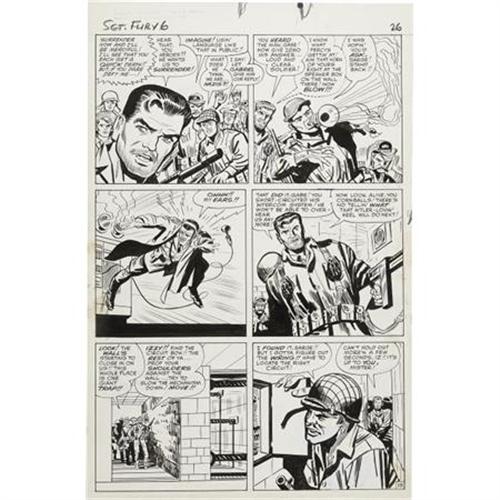 <B>Dick Ayers and George Roussos (as George Bell) - Sgt. Fury #8, page 19 Original Art (Marvel, 1964).</B></I> Gabe Jones cuts loose with a mighty blast from his bugle in these scenes from "The Death Ray of Dr. Zemo." This issue was the first to feature Dick Ayers' pencils, and he soon became the mainstay artist for the title. This page has an image area of 12.5" x 18.5", and the art is in Excellent condition.<BR><BR><b>Shipping:</b> Flat Material, Large (<a target="_blank" href="http://www.heritageauctions.com/common/shipping.php">view shipping information</a>)