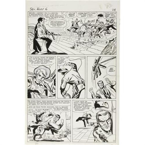 <B>Dick Ayers and George Roussos (as George Bell) - Sgt. Fury #8, page 21</B></I> <B>Original Art (Marvel, 1964).</B></I><BR> Reb Ralston saves the day with some good old-fashioned roping in these battle scenes from "The Death Ray of Dr. Zemo." This page has an image area of 12.5" x 18.5", and the art is in Excellent condition.<BR><BR><b>Shipping:</b> Flat Material, Large (<a target="_blank" href="http://www.heritageauctions.com/common/shipping.php">view shipping information</a>)