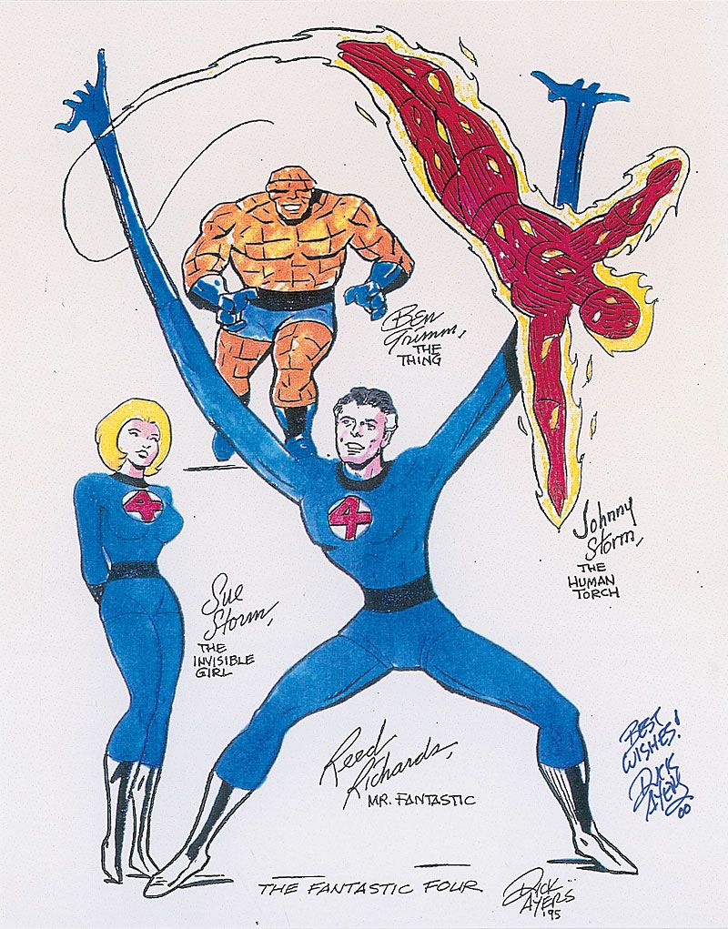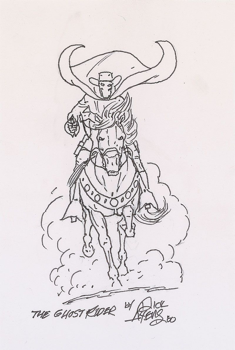 Two sketches: a printed color sketch of the Fantastic Four on an off-white 8 x 10 cardstock sheet, signed in blue felt tip, “Best Wishes! Dick Ayers”; and an original signed felt tip sketch of the Ghost Rider on an off-white 4 x 6 card.