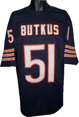 Dick Butkus is regarded as the greatest linebacker of his generation and one of the best linebackers of all-time. Butkus starred as a football player for the University of Illinois and the Chicago Bears. He became a member of the Pro Football Hall of Fame in 1979. This is a Dick Butkus Chicago Bears unsigned Navy unlicensed custom-prostyle jersey with twill stitched nameplate and numbers. Size XL