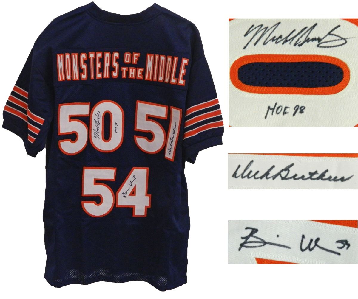 Dick Butkus, Mike Singletary and Brian Urlacher signed navy custom Monsters of the Middle football jersey. This jersey is size X-Large and has a blank front. Item comes with a Schwartz Sports Memorabilia numbered tamper-proof hologram and Certificate of Authenticity which can be verified online.