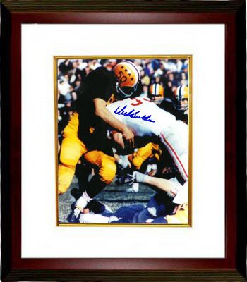 Dick Butkus played center and linebacker from 1962 through 1964 and was twice a unanimous All-American, in 1963 and 1964. Butkus won the Chicago Tribune Silver Football in 1963 as the Big Ten's Most Valuable Player, and was named the American Football Coaches Association Player of the Year in 1964. Butkus also finished sixth in Heisman Trophy balloting in 1963 and third in 1964, a remarkable achievement given his position, as Heisman voters are notorious for their strong bias toward offensive players. Dick Butkus has hand autographed thisa Illinois Fighting Illini 8x10 Photo (blue sig). Certificate of Authenticity from Athlon Sports Collectibles. Custom White Mat and Premium Mahogany Color Framed as shown.