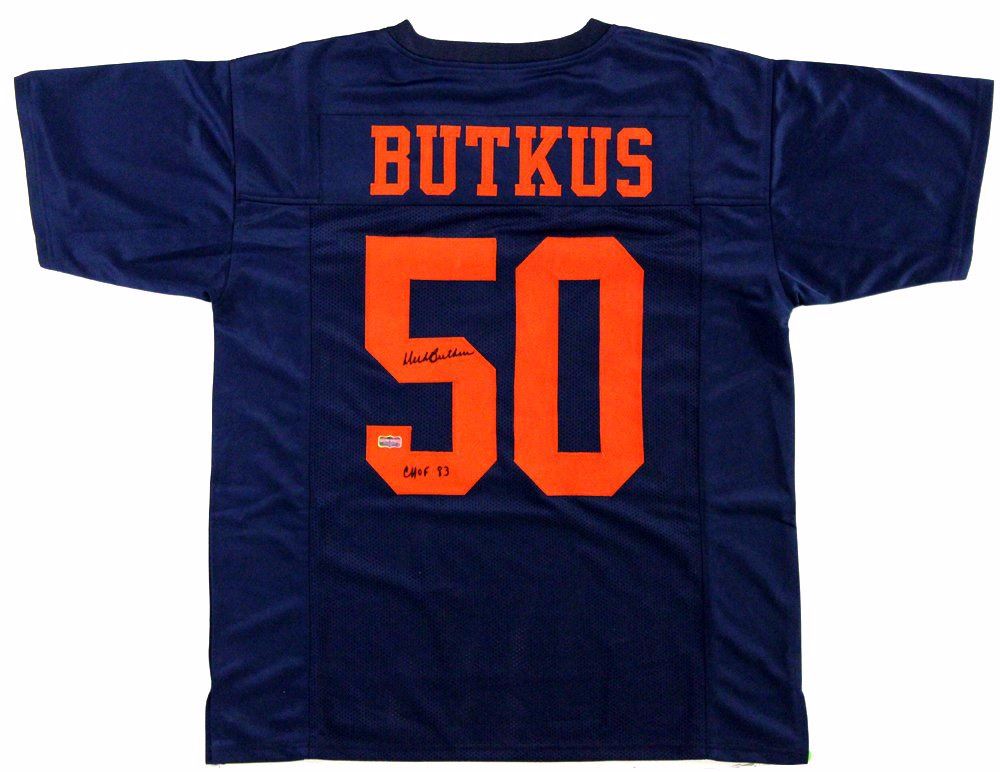 A Illinois Fighting Illini Custom Blue NCAA Jersey hand signed by Dick Butkus. The item and signature are in excellent condition. In addition to signing his name, Dick inscribed +IBw-CHOF 83+IB0 on the item. Dick is a 8x Pro Bowler, 6x First-Team All-Pro, and is a 1979 Pro Football Hall of Fame inductee.