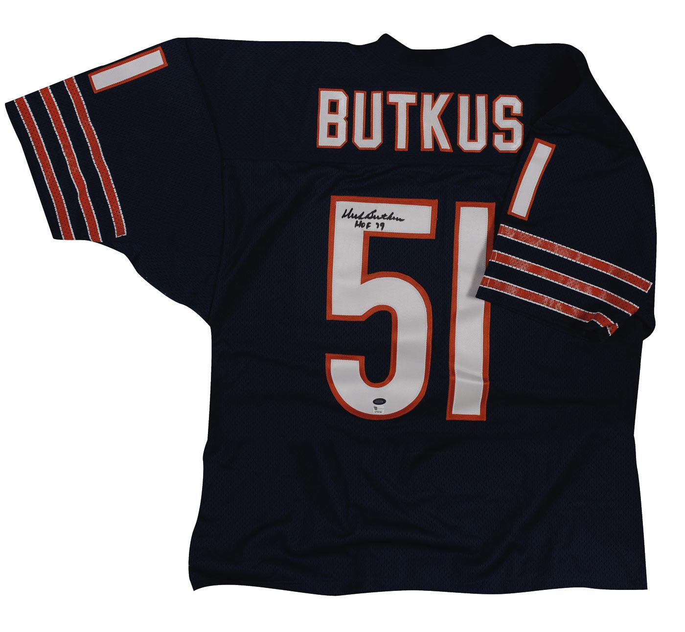 Official replica Chicago Bears football jersey, with sewn on letters and numbers, signed in black felt tip on the number on the back, “Dick Butkus, HOF 79.” In very fine condition.