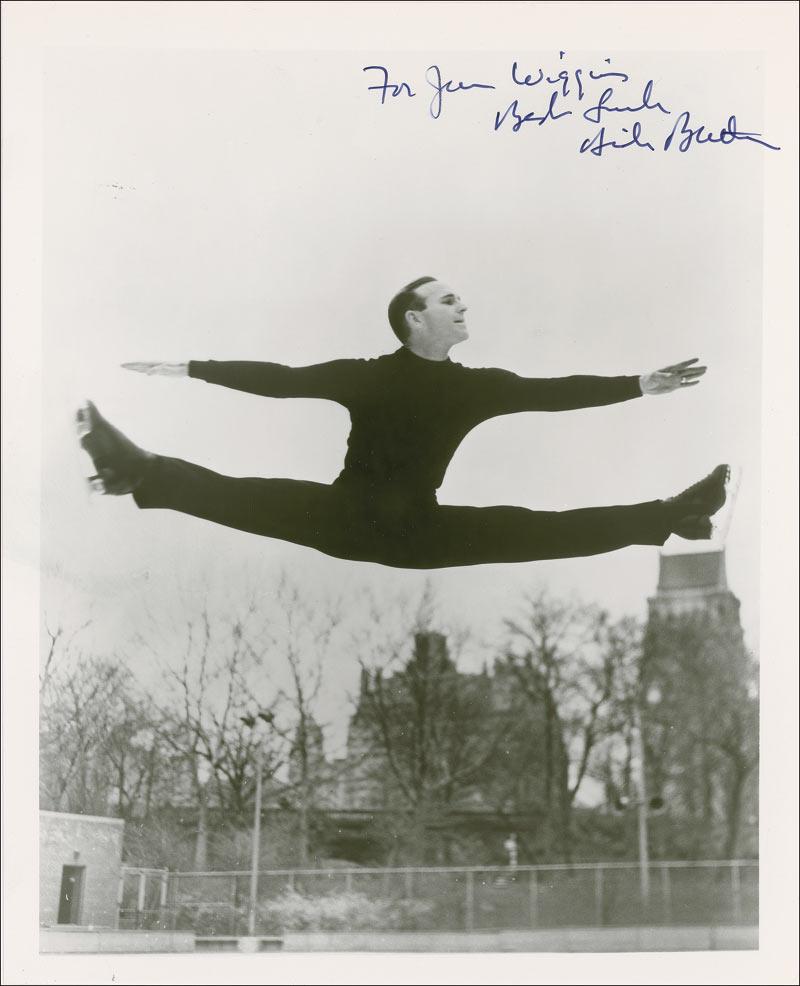 American former figure skater and long-time skating television analyst who was a two-time Olympic champion and five-time World champion. Glossy 8 x 10 photo of Button leaping through the air, signed and inscribed in black felt tip “For Jim Wiggins, Best Luck, Dick Button.” In fine condition, with a few surface marks and creases.