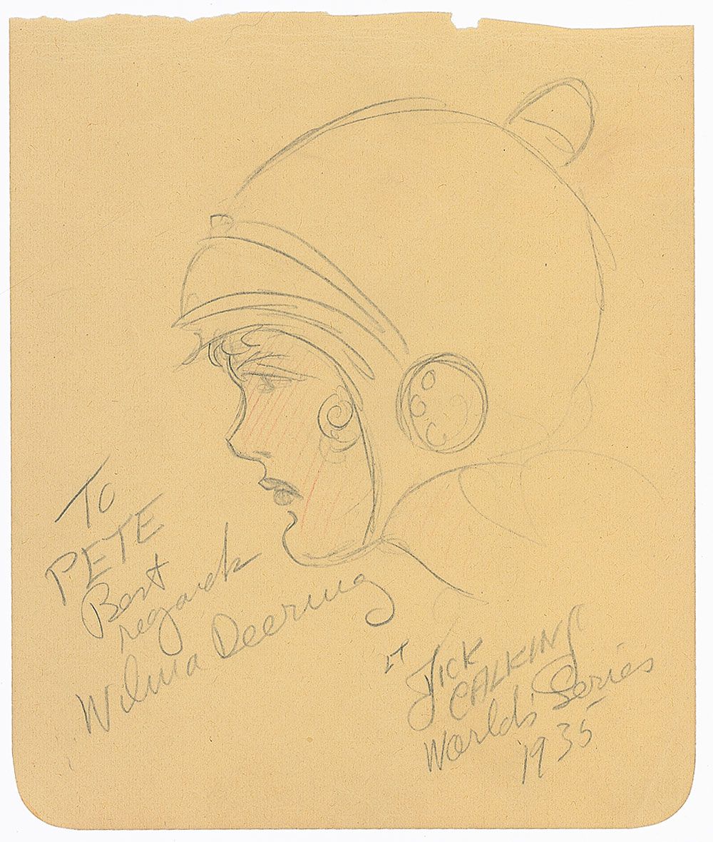 Artist (1895–1962) best known as the first person to draw the Buck Rogers comic strip, beginning in 1929. Original vintage signed pencil sketch of Wilma Deering on a yellow 4.5 x 5.5 album page, signed and inscribed, “To Pete, Best regards, Wilma Deering. Lt. Dick Calkins, World’s Series, 1935.” In fine condition, with scattered creases.