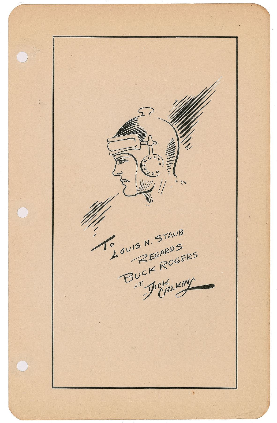 American cartoonist (1894–1962) remembered as the first artist to artist to draw the Buck Rogers comic strip. Fantastic original ink sketch of Buck Rogers in profile accomplished by Calkins on an off-white 6 x 9.5 album page, boldly signed and inscribed below, "To Louis N. Staub, Regards, Buck Rogers, Lt. Dick Calkins." In fine condition.