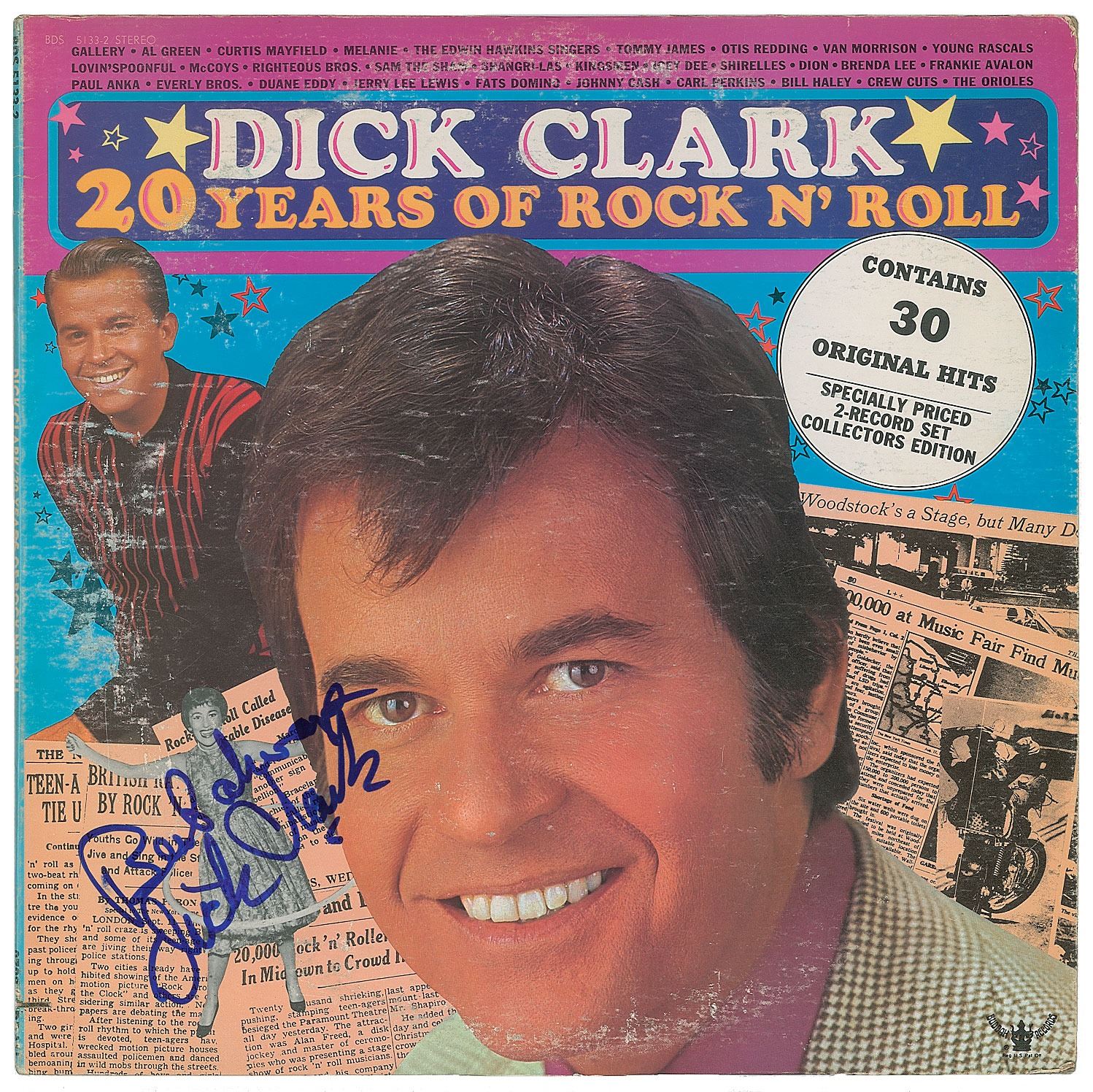 Dick Clark: 20 Years of Rock N' Roll album signed on the front cover in blue felt tip, "Best always, Dick Clark." In fine condition, with light scuffing and splitting to edges. The record is included.
