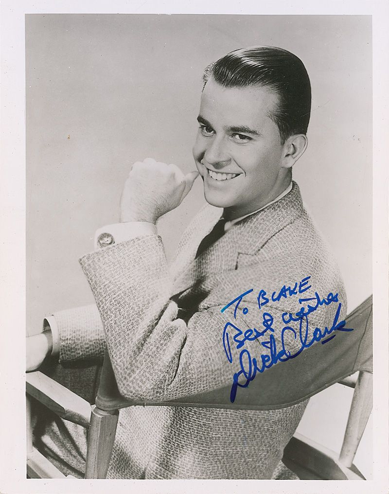 Glossy 8 x 10 photo of Clark as a young television host, signed and inscribed in blue felt tip “To Blake, Best wishes, Dick Clark.” Scattered surface sports and creases, and a crease to the lower left corner tip, otherwise fine condition.