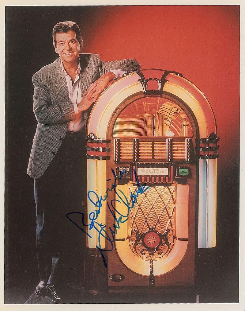 Color glossy 8 x 10 photo of Clark posing with a jukebox, signed in blue felt tip “Best wishes, Dick Clark.” In fine condition.