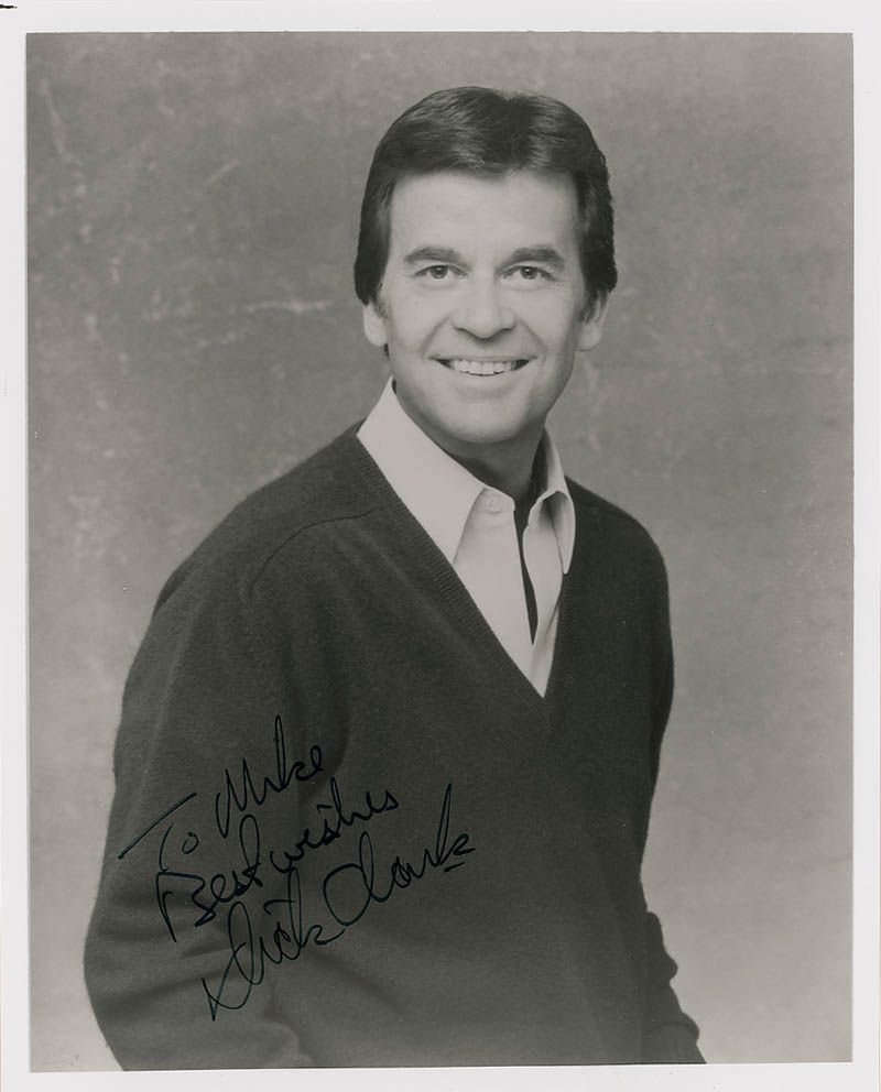 Glossy 8 x 10 photo of Clark during his American Bandstand days, signed and inscribed in black felt tip “To Mike, Best wishes, Dick Clark.” In fine condition, with a few mild surface marks and impressions. Original mailing label affixed to reverse.