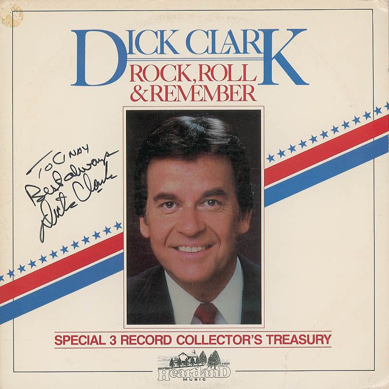 Rock, Roll & Remember album signed and inscribed on the front cover in black felt tip, “To Cindy, Best always, Dick Clark.” In very good condition, with moderate creasing to the corners, a trivial ‘ring of wear’ to the cover, and adhesive remnants to the upper left corner. The records are included.