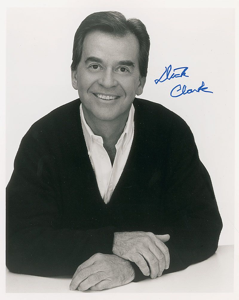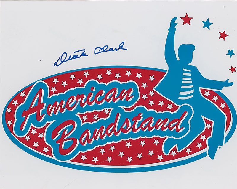 Two photos: glossy 8 x 10 portrait of Clark, signed in blue felt tip; and a color 10 x 8 photo of the American Bandstand logo, signed in blue felt tip. In very fine condition.