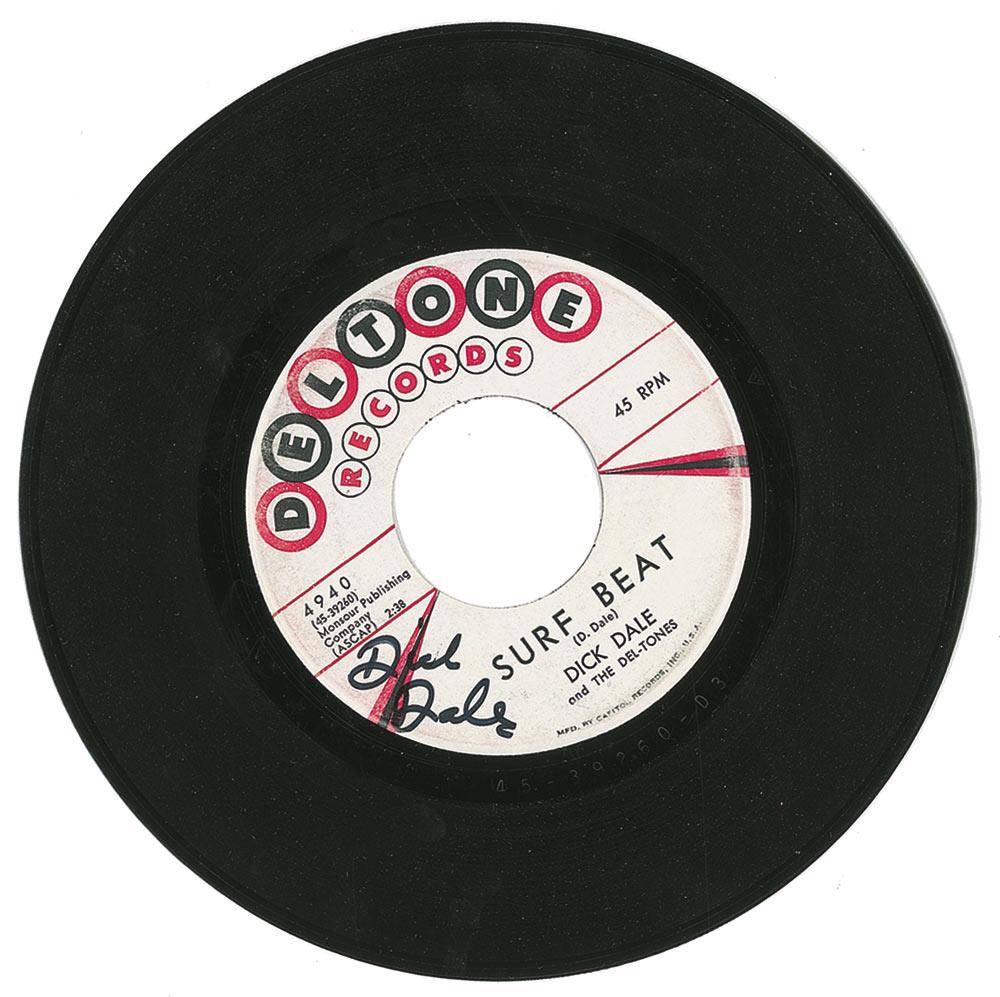 Experimental surf guitarist known as the “King of the Surf Guitar.” Vinyl 45 rpm record of “Surf Beat,” signed on the scarce, original Del-Tone Record Label in black felt tip. In fine condition. RRAuction COA.