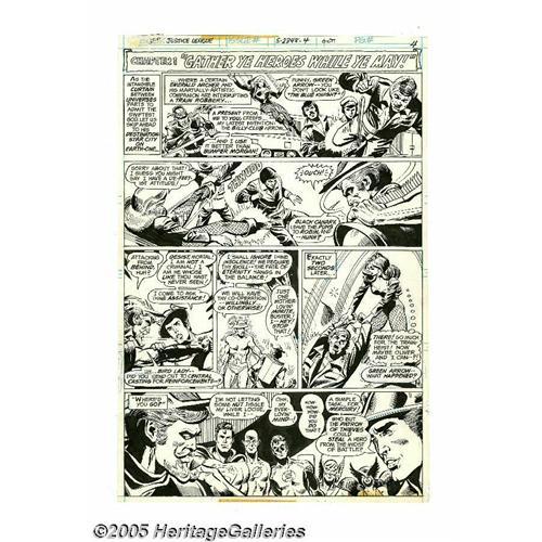 <B>Dick Dillin and Frank McLaughlin - Justice League of America #135, page 4 Original Art (DC,1976).</B></I> The Justice Leaguers of Earth One link up with the god Mercury, who looks an awful lot like the Flash of Earth Two, in this thrilling scene from ""Crisis in Eternity."" It gets mighty confusing when earths collide -- do you need a heroes roll call? Starring on this page are Green Arrow, Black Canary, Superman, Flash (Barry Allen), Green Lantern (Hal Jordan), Hawkman, Hawkgirl, and Mercury! The page has an image area of 10"" x 15"", and aside from a small glue stain at the right, the art is in Excellent condition. <BR><BR><B>Important notice:</B> Heritage usually auctions material at the rate of 200-250 lots per hour. On some occasions eBay Live bid software or the Internet may not be able to keep up with the pace of the auction. We recommend placing a realistic absentee bid now as insurance to avoid disappointment. Occasionally the auctioneer may eliminate or reject an eBay Live bid, and the auctioneer may also reopen a lot after the close of the eBay live bidding (usually because we missed an audience bid), and may reject your bid even if it shows you as the winning bidder. By bidding via eBay Live, you agree that Heritage may award the lot to another bidder at its sole discretion under the circumstances described above or any other reasonable circumstances. Since eBay bids are not shown to us until we open the lot on the floor, we treat those bids just like floor bids. In most cases the floor responds before the eBay bid is presented to us, due to Internet lag time, so for consistency we have made it a policy that floor bids are always considered first over tie eBay live bids. Also please note that all Heritage lots purchased through eBay Live carry a 20% Buyer's Premium. Please make sure you read the Terms and Conditions before you bid. This lot is being auctioned in conjunction with a live floor auction by Heritage Galleries & Auctioneers. All final aucti