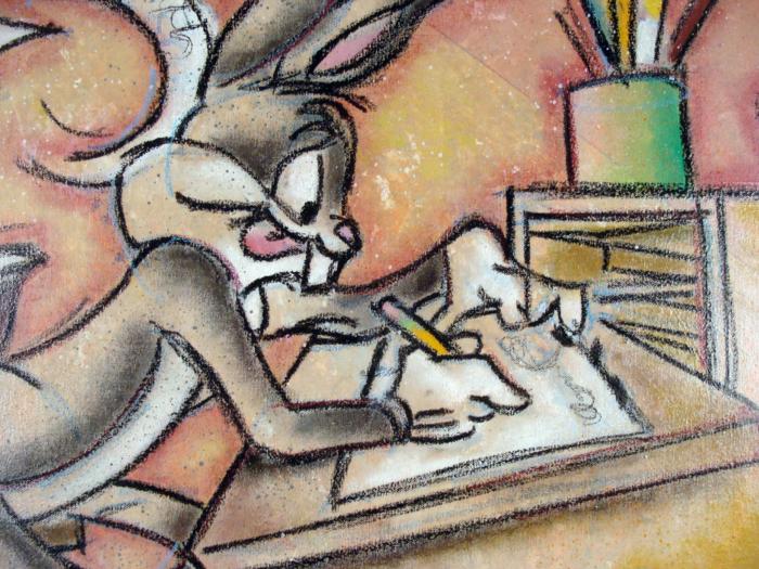 Here's Bugs Bunny hard at work at something he should know well--animation! Artist Dick Duerrstein also knows animation quite well, and he brings a natural sketchy style to this fantastic original paintingArtist: Dick DuerrsteinTitle: "Bugs Animation Factory"Medium: Acrylic paint on stretched canvasSigned by the artist, lower left, and on the verso Other markings: Artist's name stamped on versoImage size: 30" x 40" Condition: MintThis imaginative original painting captures the frenetic spirit of the animator, and magic of cartoon art. Duerrstein's work can be found in the Walt Disney Studio corporate offices, Burbank, California; The Library of Congress, Washington, D.C. and St. Jude's Research Hospital in Memphis, Tennessee and private collections worldwide.