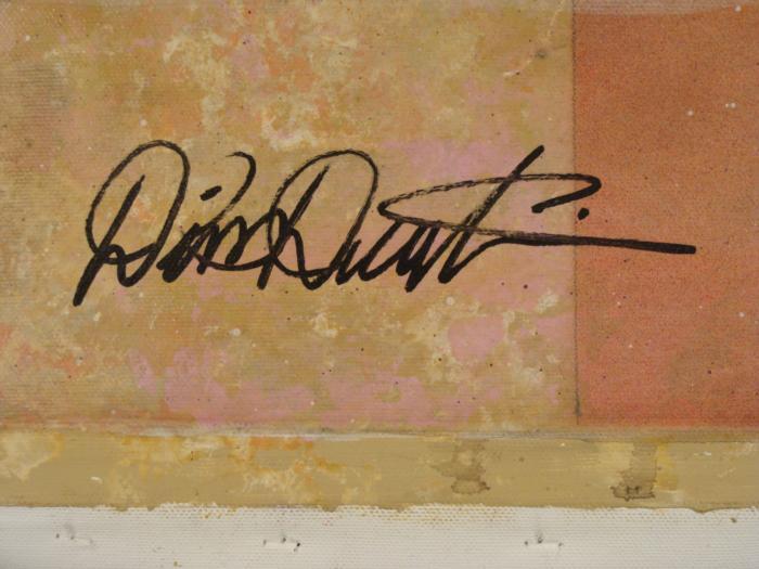 Here's an original painting of a rather daffy cowboy it's Daffy Duck! Animation artist Dick Duerrstein knows how to capture Daffy at his favorite saloon, and he also gives this piece a Modern Art flair. Its impressive size will stop foes in their tracks!Artist: Dick DuerrsteinTitle: "Pardners 1"Medium: Acrylic paint on canvas- with painted edges, ready to stretch on a frame Signed by the artist, lower right, and on the verso Other markings: Artist's name stamped on versoImage size: 24" x 48" xcellent- previously on a frame, with staple holes present near the edgesCertificate of Authenticity: Included Daffy Duck is well suited to the Wild West, and Duerrstein captures him in what is really a fine work of art. Duerrstein's work can be found in the Walt Disney Studio corporate offices, Burbank, California; The Library of Congress, Washington, D.C. and St. Jude's Research Hospital in Memphis, Tennessee and private collections worldwide.