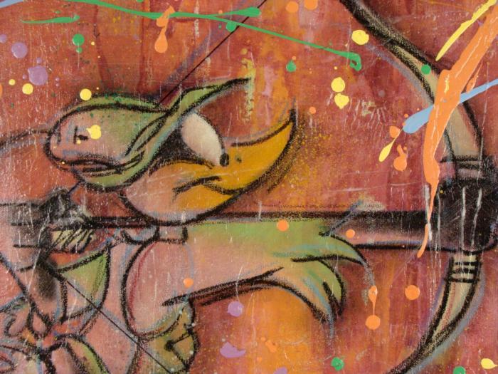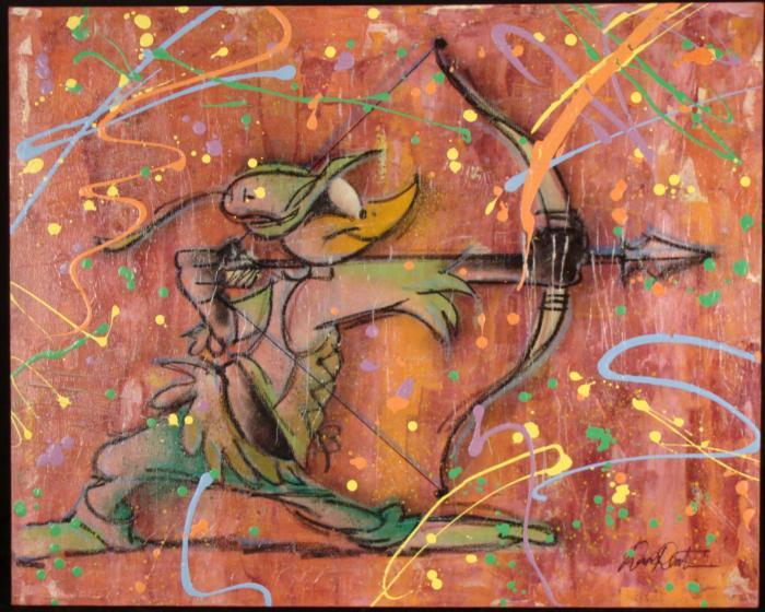 Here's an original painting of the famous Robin Hood--only it's really Daffy Duck dressed up! Animation artist Dick Duerrstein portrays the great and daffy Robin Hood amidst colorful splashes of paint, in a modern Pop Art style. Artist: Dick Duerrstein Medium: Acrylic paint on stretched canvasSigned by the artist, lower left, and on the verso Other markings: Artist's name stamped on verso Size: 24" x 30" Condition: MintThis is a modern twist on a classic cartoon rendition of the legendary prince of thieves!Duerrstein's work can be found in the Walt Disney Studio corporate offices, Burbank, California; The Library of Congress, Washington, D.C. and St. Jude's Research Hospital in Memphis, Tennessee and private collections worldwide.
