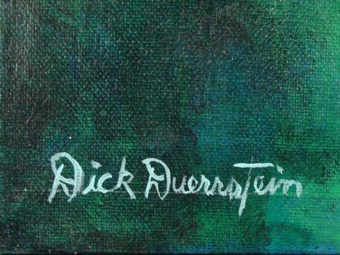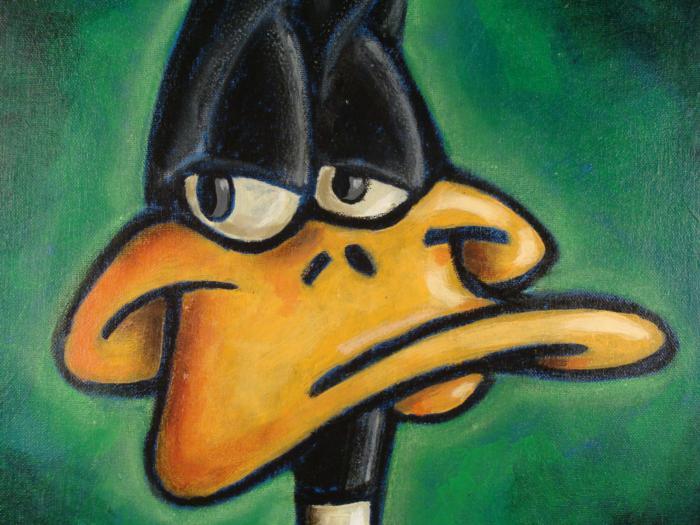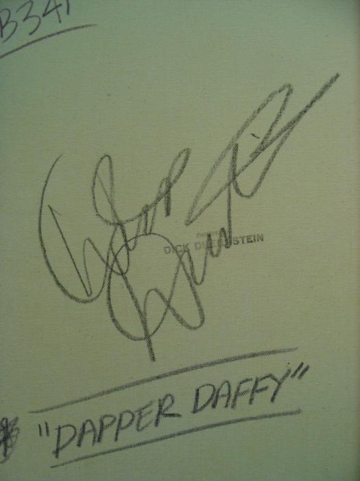 Here's an original painting of a daffy yet dapper fellow-- it's Daffy Duck! Animation artist Dick Duerrstein knows how to capture Daffy with that perfect dapper gaze, and here it is, in a vibrant green background. Artist: Dick Duerrstein Title: "Dapper Daffy" Medium: Acrylic paint stretched on canvas- with painted edges Signed by the artist, lower left, and on the verso Other markings: Artist's name stamped on verso Image size: 16" x 20" Condition: MintDaffy Duck fancies himself a dapper chap, and he certainly looks that way in this terrific original painting.Duerrstein's work can be found in the Walt Disney Studio corporate offices, Burbank, California; The Library of Congress, Washington, D.C. and St. Jude's Research Hospital in Memphis, Tennessee and private collections worldwide.