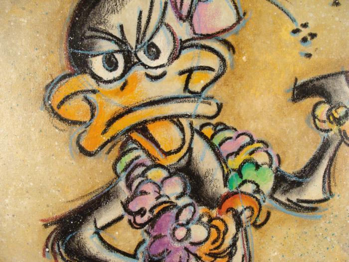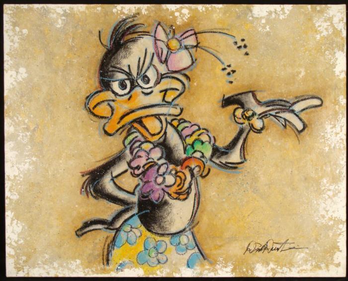 Daffy Duck goes Hawaiian in this fantastic original painting by artist Dick Duerrstein. Daffy has quite a look here, but his expression has the same sarcasm as always. Artist: Dick Duerrstein Medium: Acrylic paint on stretched canvasSigned by the artist, lower left, and on the verso Other markings: Artist's name stamped on verso Size: 24" x 30" Condition: MintIf you love Daffy Duck and would like a little tropical flair, you'll really enjoy this original painting.Duerrstein's work can be found in the Walt Disney Studio corporate offices, Burbank, California; The Library of Congress, Washington, D.C. and St. Jude's Research Hospital in Memphis, Tennessee and private collections worldwide.