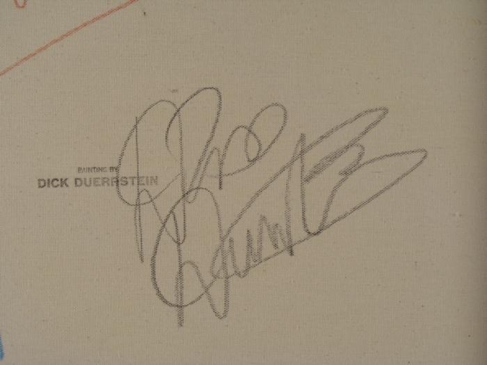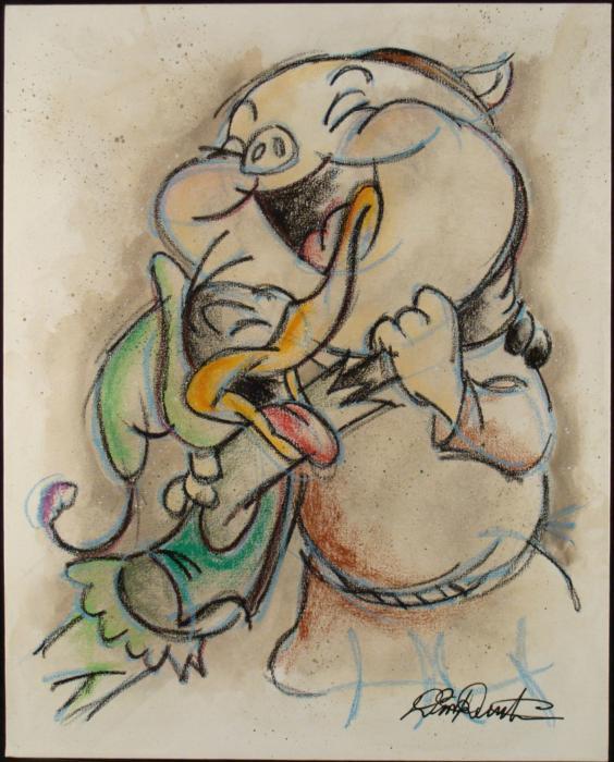 This original painting is from a classic Warner Brother cartoon scene, featuring a laughing Daffy Duck and Porky Pig. Animation artist Dick Duerrstein knows his Looney Tunes characters, and knows just how to capture a Looney moment like this, in a natural sketchy style. Medium: Oil paint on stretched canvas Signed by the artist, lower right, and on the verso Other markings: Artist name stamped on verso Dimensions: 24" x 30" Condition: Mint Certificate of Authenticity: Included These are two favorite characters in one terrific original painting, for any Looney Tunes fan!Duerrstein's work can be found in the Walt Disney Studio corporate offices, Burbank, California; The Library of Congress, Washington, D.C. and St. Jude's Research Hospital in Memphis, Tennessee and private collections worldwide.