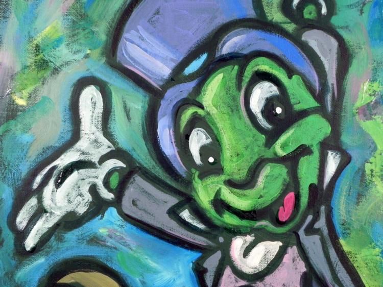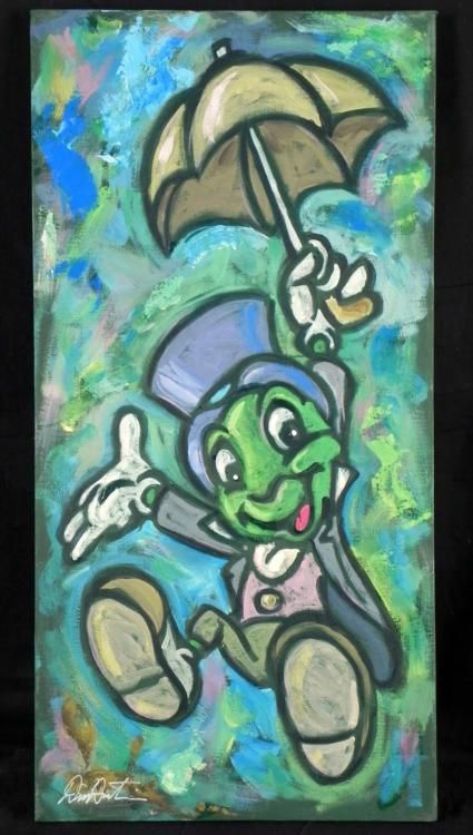 Jiminy Cricket has arrived, floating down on his little umbrella, among vivid patches of color. This is a spendid work of animation art, created by artist Dick Duerrstein who knows how to paint a true portrait. * * Artist: Dick DuerrsteinMedium: Acrylic paint on stretched canvas Signature: Signed by the artist, lower left, and on the versoMarkings: Artist name stamped on verso, and on the frameDimensions: 15" x 30" Condition: Mint Jiminy Cricket is one of the most beloved characters in animation history, and he's given a wonderful portrayal in this original painting. * Duerrstein's work can be found in the Walt Disney Studio corporate offices, Burbank, California; The Library of Congress, Washington, D.C. and St. Jude's Research Hospital in Memphis, Tennessee and private collections worldwide. *