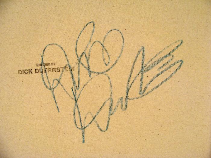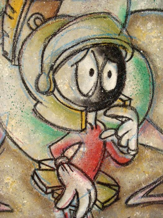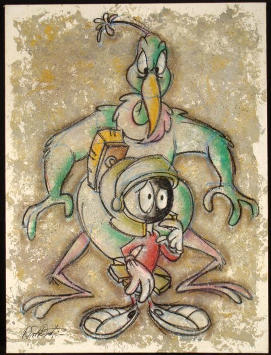 Here is the meddlesome Marvin the Martian, along with a large funny buzzard. We're not sure what episode the buzzard is from, but you can be sure that Animation artist Dick Duerrstein knew when he did this artwork, because he's an expert in the art of cartoons. Medium: Acrylic paint on stretched canvas Signature: Signed by the artist, lower left, and on the versoOther markings: Artist name stamped on verso, and on the frameDimensions: 30" x 40" Condition: Mint This is a great image of that other-worldly foe, and the rarely seen bird! Duerrstein's work can be found in the Walt Disney Studio corporate offices, Burbank, California; The Library of Congress, Washington, D.C. and St. Jude's Research Hospital in Memphis, Tennessee and private collections worldwide.
