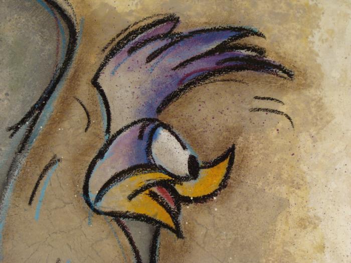 This original painting portrays the Road Runner, as he's jumping up and ready to take off down the road. Artist Dick Duerrstein captures the Road Runner here, with great expression, and a background with natural surface crazing resembling a desert. Medium: Acrylic paint on stretched canvas Signature: Signed by the artist, lower left, and on the versoOther markings: Artist name stamped on the verso Dimensions: 24" x 36" Condition: Mint Certificate of Authenticity: Included This is a great portrayal of the Road Runner, and it's so good you can almost hear him going BEEP BEEP! Duerrstein's work can be found in the Walt Disney Studio corporate offices, Burbank, California; The Library of Congress, Washington, D.C. and St. Jude's Research Hospital in Memphis, Tennessee and private collections worldwide.